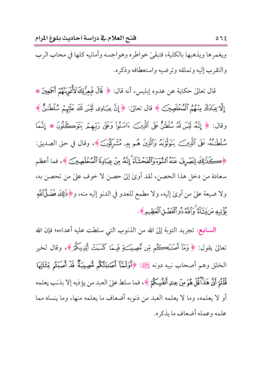 قال تعالى حكاية عن عدوه إبليس، أنه قال: {قَالَ فَبِعِزَّتِكَ لَأُغْوِيَنَّهُمْ أَجْمَعِينَ * إِلَّا عِبَادَكَ مِنْهُمُ الْمُخْلَصِينَ} قال تعالى: {إِنَّ عِبَادِي لَيْسَ لَكَ عَلَيْهِمْ سُلْطَانٌ} وقال: {إِنَّهُ لَيْسَ لَهُ سُلْطَانٌ عَلَى الَّذِينَ آمَنُوا وَعَلَى رَبِّهِمْ يَتَوَكَّلُونَ * إِنَّمَا سُلْطَانُهُ عَلَى الَّذِينَ يَتَوَلَّوْنَهُ وَالَّذِينَ هُمْ بِهِ مُشْرِكُونَ}، وقال في حق الصديق: {كَذَلِكَ لِنَصْرِفَ عَنْهُ السُّوءَ وَالْفَحْشَاءَ إِنَّهُ مِنْ عِبَادِنَا الْمُخْلَصِينَ}، فما أعظم سعادة من دخل هذا الحصن، لقد آوى إلى حصن لا خوف على من تحصن به، ولا ضيعة على من آوى إليه، ولا مطمع للعدو في الدنو إليه منه، و {ذَلِكَ فَضْلُ اللَّهِ يُؤْتِيهِ مَنْ يَشَاءُ وَاللَّهُ ذُو الْفَضْلِ الْعَظِيمِ}.