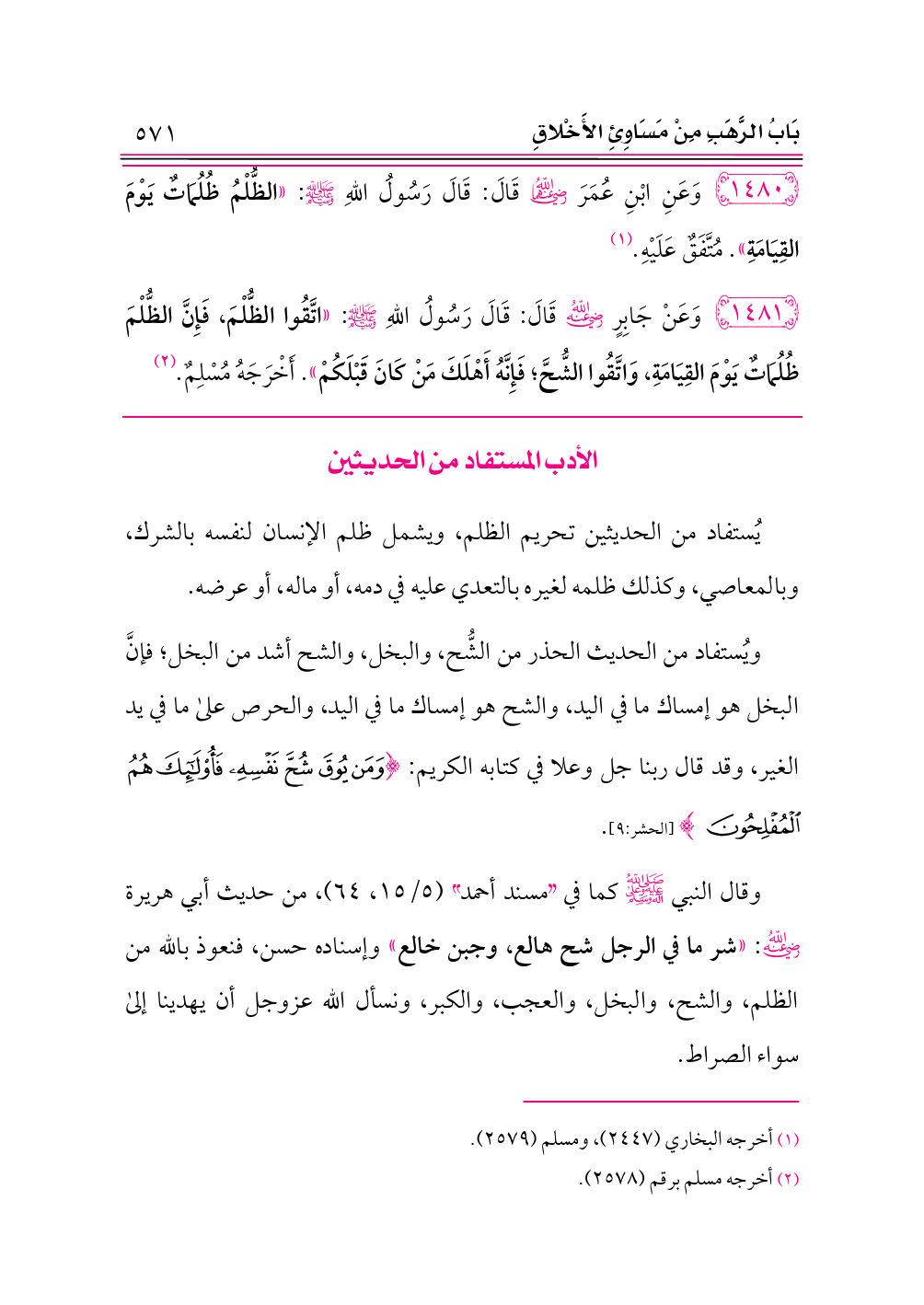 ١٤٨١ - وَعَنْ جَابِرٍ -رضي الله عنه- قَالَ: قَالَ رَسُولُ اللهِ - صلى الله عليه وسلم -: «اتَّقُوا الظُّلْمَ، فَإِنَّ الظُّلْمَ ظُلُمَاتٌ يَوْمَ القِيَامَةِ، وَاتَّقُوا الشُّحَّ؛ فَإِنَّهُ أَهْلَكَ مَنْ كَانَ قَبْلَكُمْ». أَخْرَجَهُ مُسْلِمٌ. (¬٢)