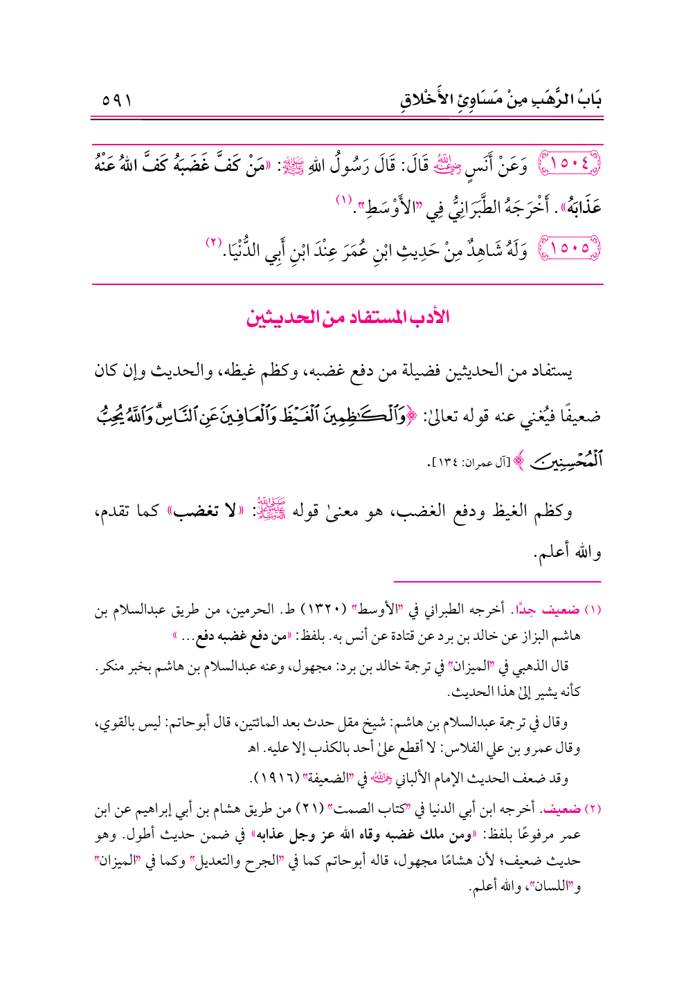يستفاد من الحديثين فضيلة من دفع غضبه، وكظم غيظه، والحديث وإن كان ضعيفًا فيُغني عنه قوله تعالى: {وَالْكَاظِمِينَ الْغَيْظَ وَالْعَافِينَ عَنِ النَّاسِ وَاللَّهُ يُحِبُّ الْمُحْسِنِينَ} [آل عمران: ١٣٤].