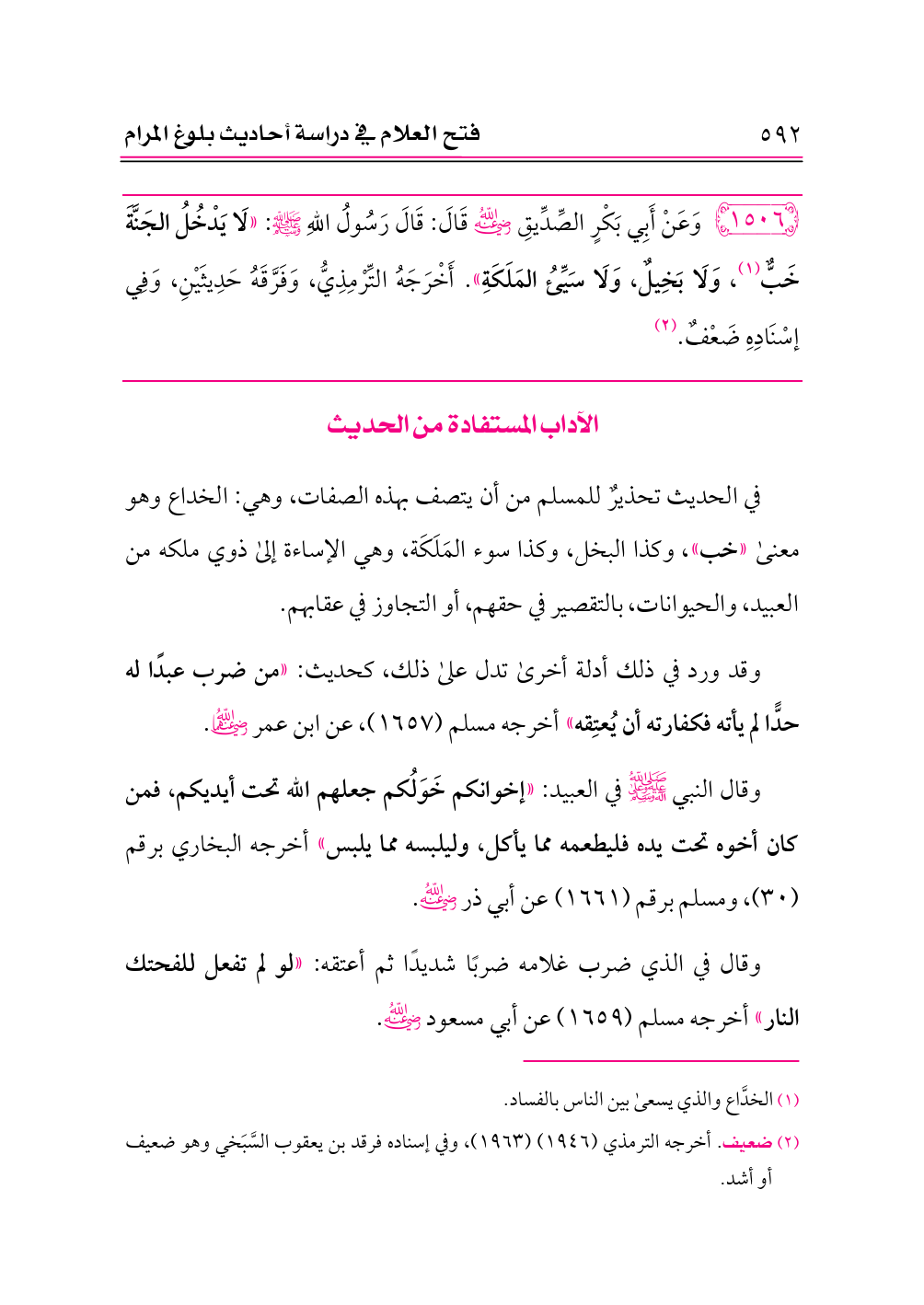 ١٥٠٦ - وَعَنْ أَبِي بَكْرٍ الصِّدِّيقِ -رضي الله عنه- قَالَ: قَالَ رَسُولُ اللهِ - صلى الله عليه وسلم -: «لَا يَدْخُلُ الجَنَّةَ خَبٌّ (¬١)، وَلَا بَخِيلٌ، وَلَا سَيِّئُ المَلَكَةِ». أَخْرَجَهُ التِّرْمِذِيُّ، وَفَرَّقَهُ حَدِيثَيْنِ، وَفِي إسْنَادِهِ ضَعْفٌ. (¬٢)