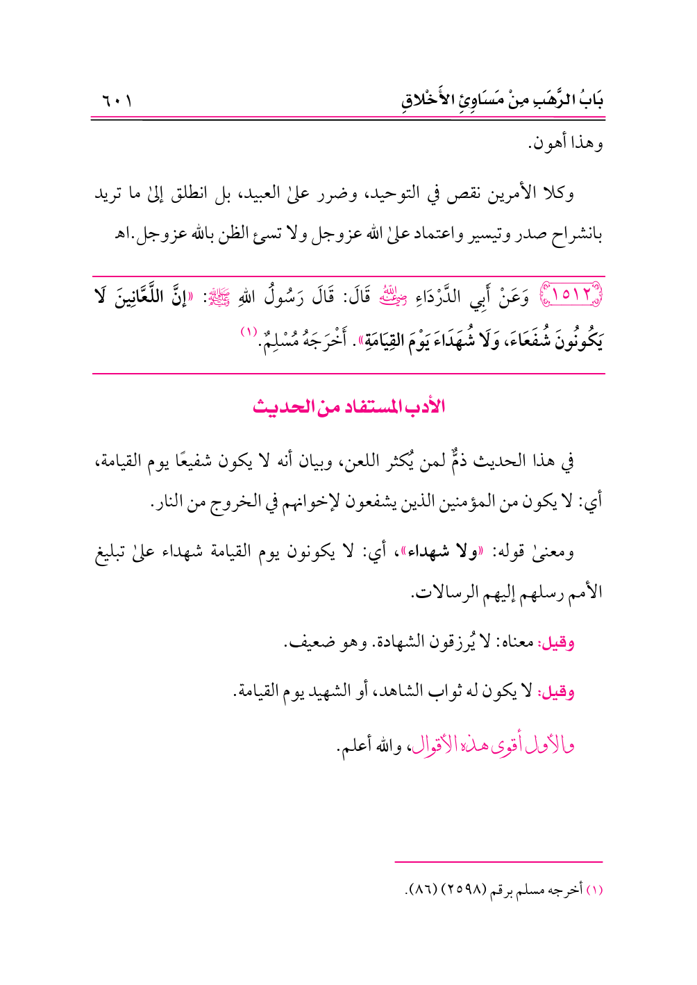 ١٥١٢ - وَعَنْ أَبِي الدَّرْدَاءِ -رضي الله عنه- قَالَ: قَالَ رَسُولُ اللهِ - صلى الله عليه وسلم -: «إنَّ اللَّعَّانِينَ لَا يَكُونُونَ شُفَعَاءَ، وَلَا شُهَدَاءَ يَوْمَ القِيَامَةِ». أَخْرَجَهُ مُسْلِمٌ. (¬١)
