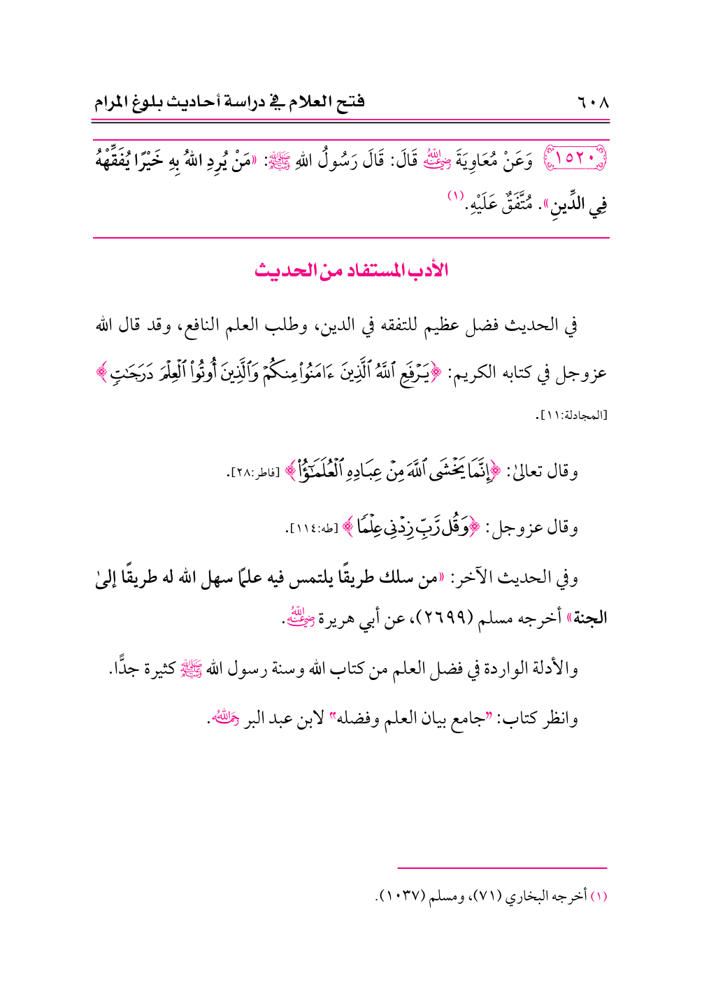 ١٥٢٠ - وَعَنْ مُعَاوِيَةَ -رضي الله عنه- قَالَ: قَالَ رَسُولُ اللهِ - صلى الله عليه وسلم -: «مَنْ يُرِدِ اللهُ بِهِ خَيْرًا يُفَقِّهْهُ فِي الدِّينِ». مُتَّفَقٌ عَلَيْهِ. (¬١)