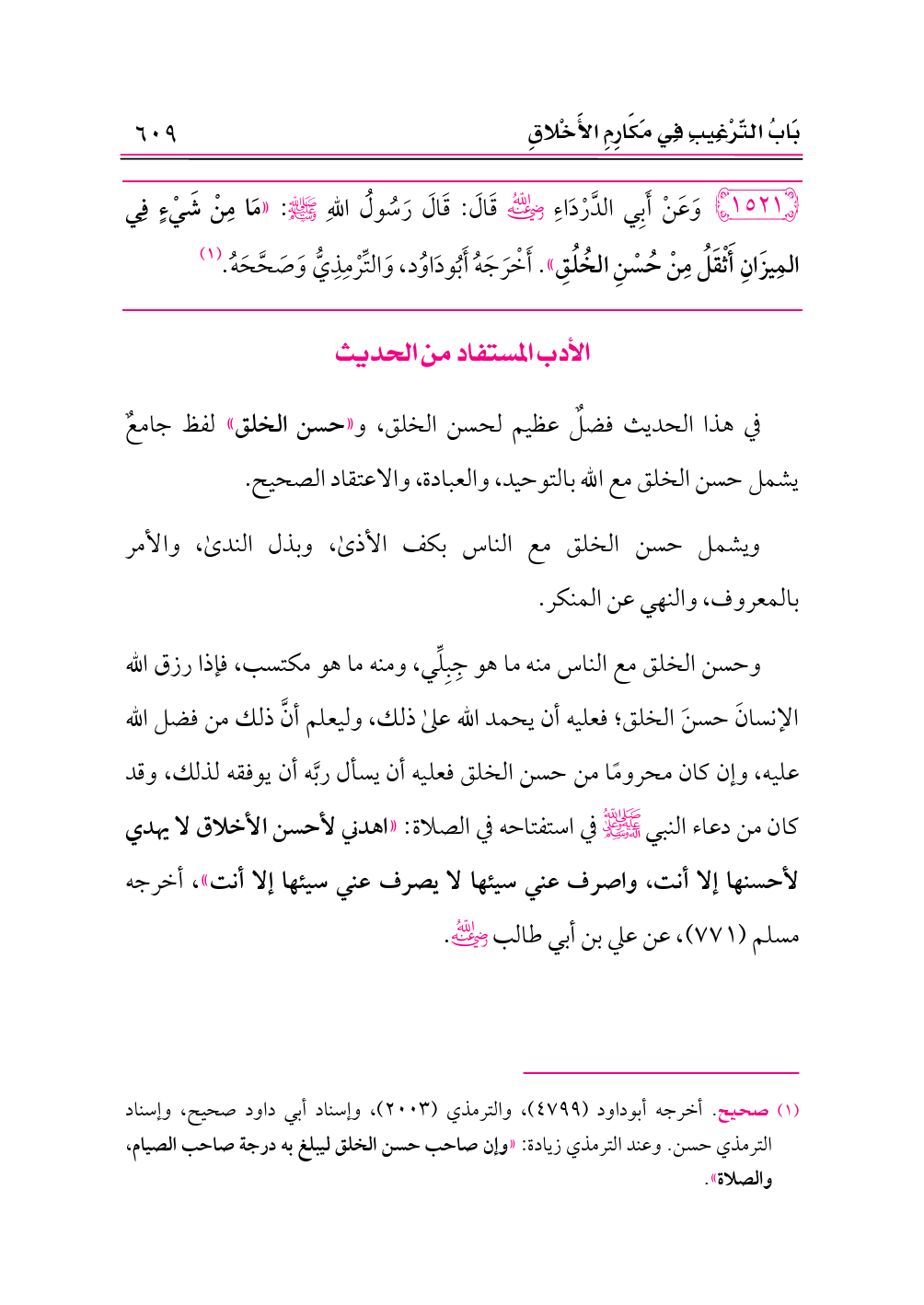 ١٥٢١ - وَعَنْ أَبِي الدَّرْدَاءِ -رضي الله عنه- قَالَ: قَالَ رَسُولُ اللهِ - صلى الله عليه وسلم -: «مَا مِنْ شَيْءٍ فِي المِيزَانِ أَثْقَلُ مِنْ حُسْنِ الخُلُقِ». أَخْرَجَهُ أَبُودَاوُد، وَالتِّرْمِذِيُّ وَصَحَّحَهُ. (¬١)