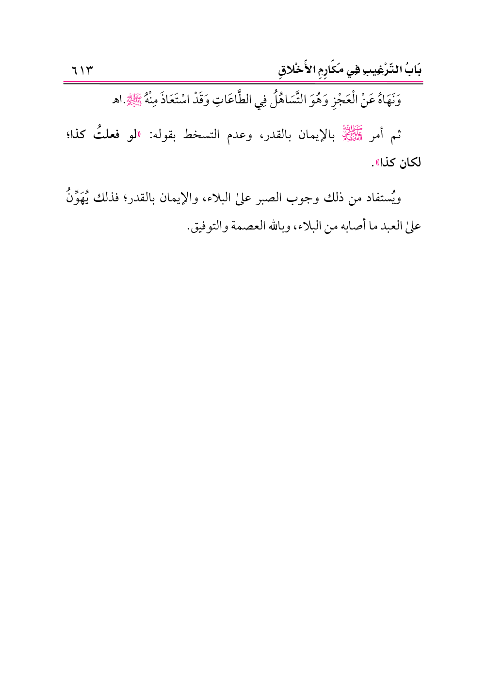 ثم أمر -صلى الله عليه وعلى آله وسلم- بالإيمان بالقدر، وعدم التسخط بقوله: «لو فعلتُ كذا؛ لكان كذا».