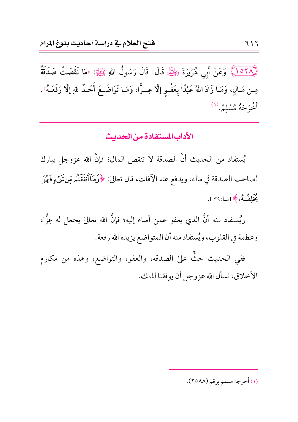 ١٥٢٨ - وَعَنْ أَبِي هُرَيْرَةَ -رضي الله عنه- قَالَ: قَالَ رَسُولُ اللهِ - صلى الله عليه وسلم -: «مَا نَقَصَتْ صَدَقَةٌ مِنْ مَالٍ، وَمَا زَادَ اللهُ عَبْدًا بِعَفْوٍ إلَّا عِزًّا، وَمَا تَوَاضَعَ أَحَدٌ للهِ إلَّا رَفَعَهُ». أَخْرَجَهُ مُسْلِمٌ. (¬١)