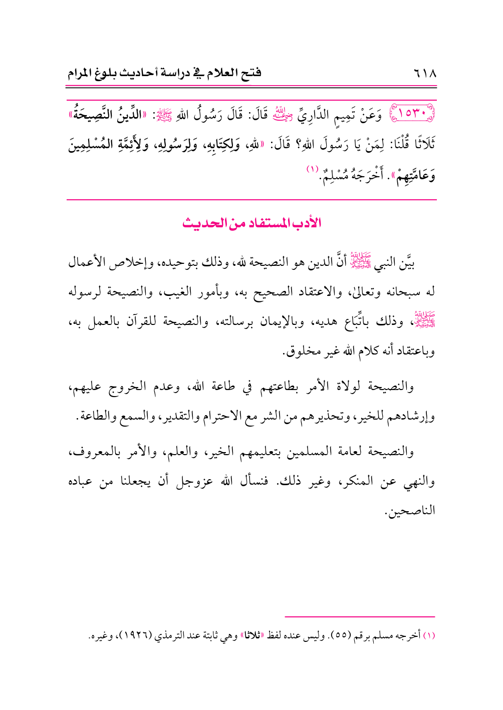 ١٥٣٠ - وَعَنْ تَمِيمٍ الدَّارِيِّ -رضي الله عنه- قَالَ: قَالَ رَسُولُ اللهِ - صلى الله عليه وسلم -: «الدِّينُ النَّصِيحَةُ» ثَلَاثًا قُلْنَا: لِمَنْ يَا رَسُولَ اللهِ؟ قَالَ: «للهِ، وَلِكِتَابِهِ، وَلِرَسُولِهِ، وَلِأَئِمَّةِ المُسْلِمِينَ وَعَامَّتِهِمْ». أَخْرَجَهُ مُسْلِمٌ. (¬١)