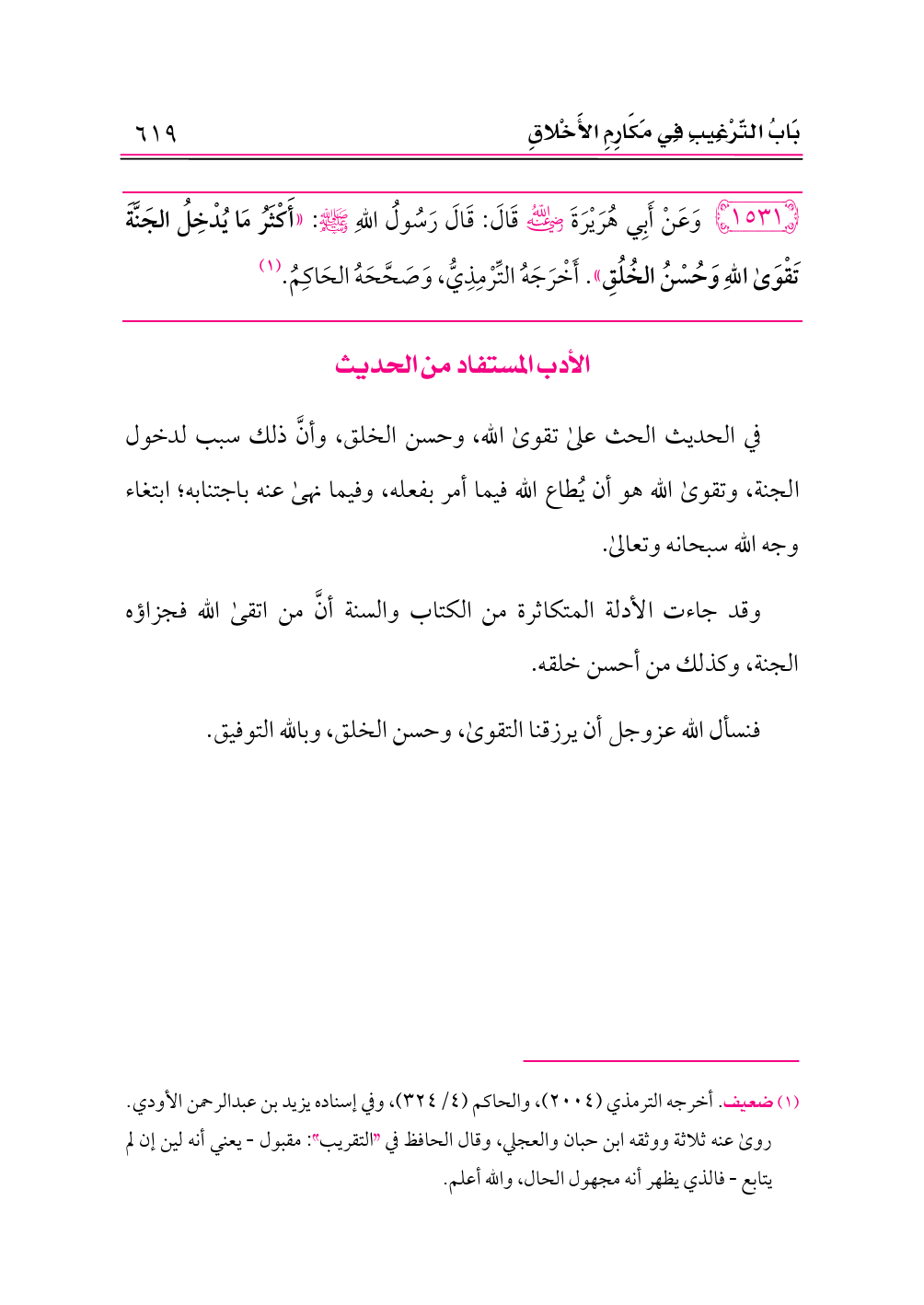 ١٥٣١ - وَعَنْ أَبِي هُرَيْرَةَ -رضي الله عنه- قَالَ: قَالَ رَسُولُ اللهِ - صلى الله عليه وسلم -: «أَكْثَرُ مَا يُدْخِلُ الجَنَّةَ تَقْوَى اللهِ وَحُسْنُ الخُلُقِ». أَخْرَجَهُ التِّرْمِذِيُّ، وَصَحَّحَهُ الحَاكِمُ. (¬١)