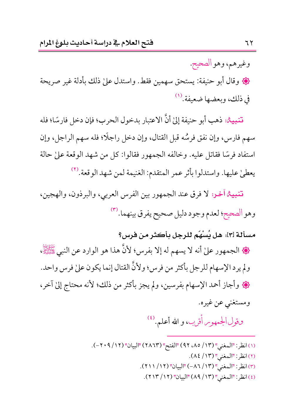 تنبيه آخر: لا فرق عند الجمهور بين الفرس العربي، والبرذون، والهجين، وهو الصحيح؛ لعدم وجود دليل صحيح يفرق بينهما. (¬٣)