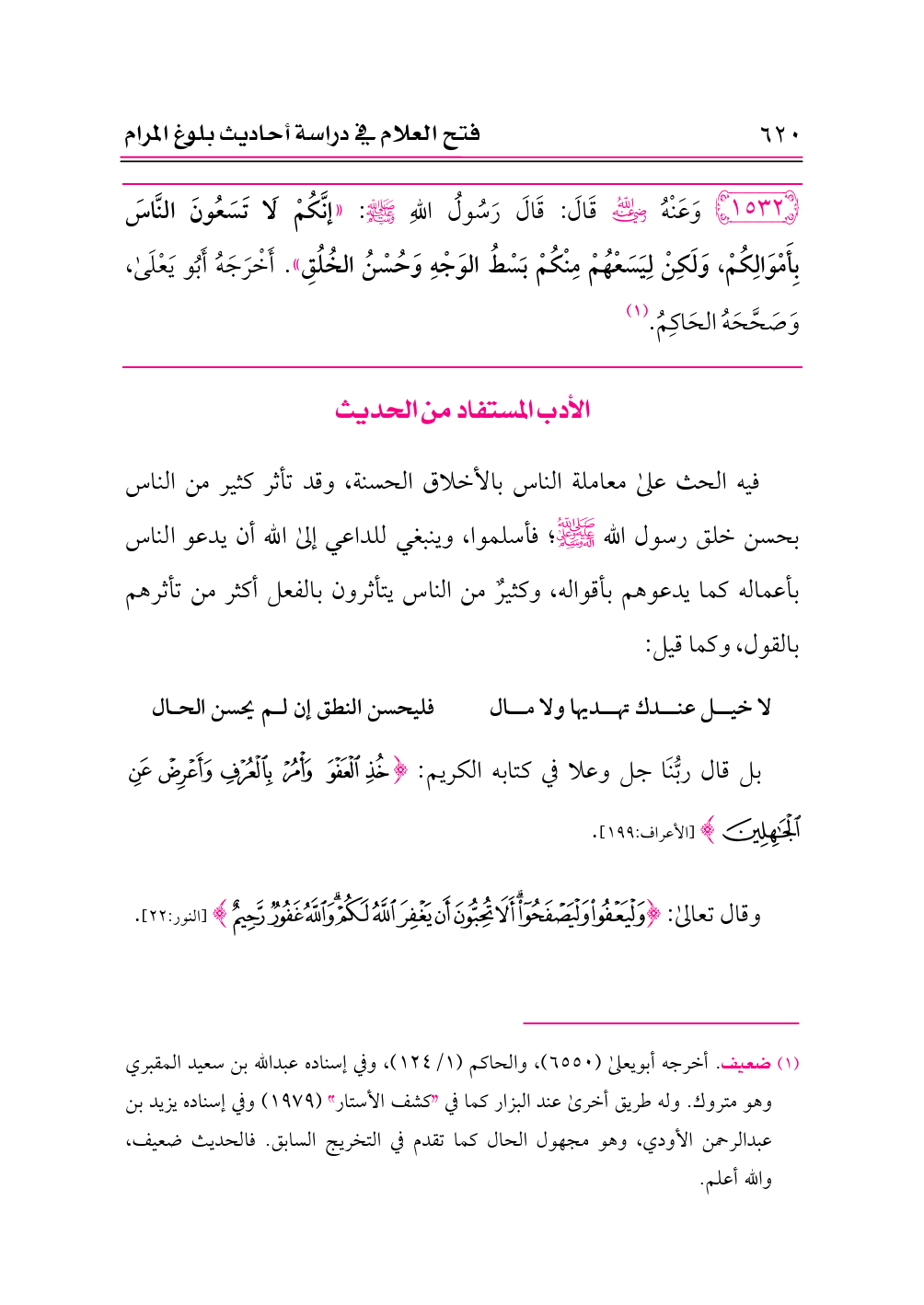 ١٥٣٢ - وَعَنْهُ -رضي الله عنه- قَالَ: قَالَ رَسُولُ اللهِ - صلى الله عليه وسلم -: «إنَّكُمْ لَا تَسَعُونَ النَّاسَ بِأَمْوَالِكُمْ، وَلَكِنْ لِيَسَعْهُمْ مِنْكُمْ بَسْطُ الوَجْهِ وَحُسْنُ الخُلُقِ». أَخْرَجَهُ أَبُو يَعْلَى، وَصَحَّحَهُ الحَاكِمُ. (¬١)