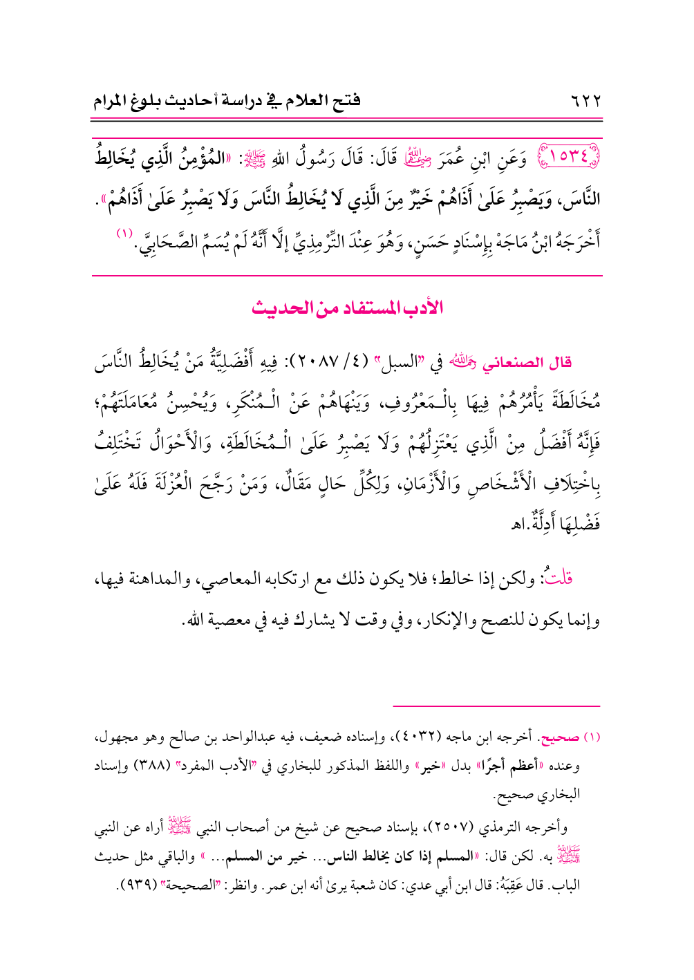 ١٥٣٤ - وَعَنِ ابْنِ عُمَرَ -رضي الله عنهما- قَالَ: قَالَ رَسُولُ اللهِ - صلى الله عليه وسلم -: «المُؤْمِنُ الَّذِي يُخَالِطُ النَّاسَ، وَيَصْبِرُ عَلَى أَذَاهُمْ خَيْرٌ مِنَ الَّذِي لَا يُخَالِطُ النَّاسَ وَلَا يَصْبِرُ عَلَى أَذَاهُمْ». أَخْرَجَهُ ابْنُ مَاجَهْ بِإِسْنَادٍ حَسَنٍ، وَهُوَ عِنْدَ التِّرْمِذِيِّ إلَّا أَنَّهُ لَمْ يُسَمِّ الصَّحَابِيَّ. (¬١)