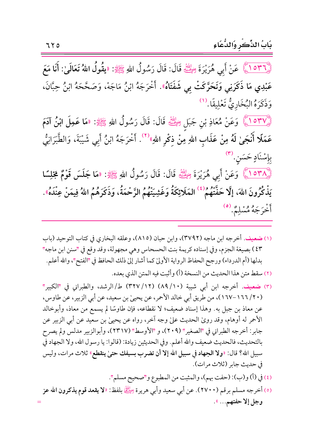 ١٥٣٦ - عَنْ أَبِي هُرَيْرَةَ -رضي الله عنه- قَالَ: قَالَ رَسُولُ اللهِ - صلى الله عليه وسلم -: «يقُولُ اللهُ تَعَالَى: أَنَا مَعَ عَبْدِي مَا ذَكَرَنِي وَتَحَرَّكَتْ بِي شَفَتَاهُ». أَخْرَجَهُ ابْنُ مَاجَهْ، وَصَحَّحَهُ ابْنُ حِبَّانَ، وَذَكَرَهُ البُخَارِيُّ تَعْلِيقًا. (¬١)