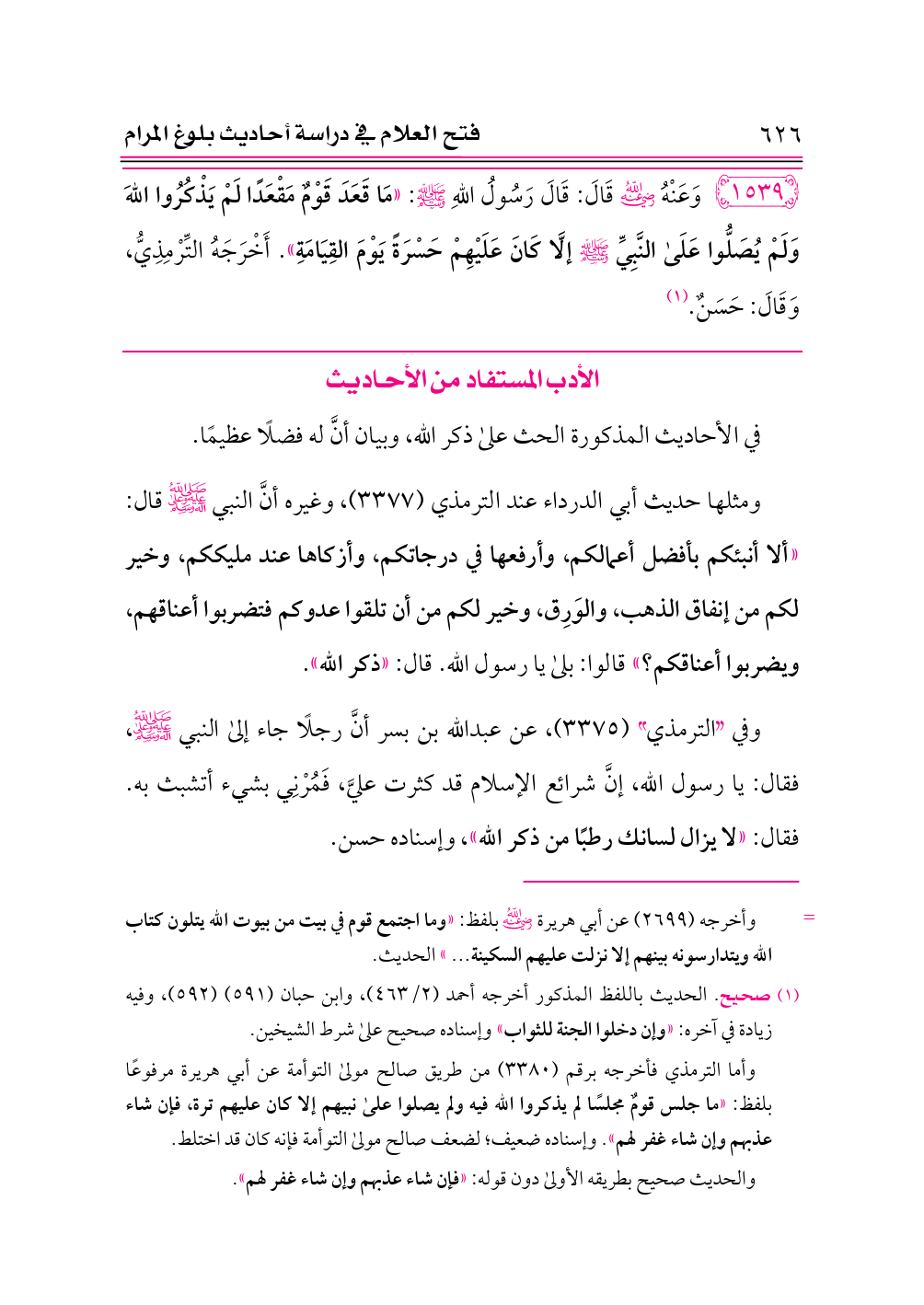 ١٥٣٩ - وَعَنْهُ -رضي الله عنه- قَالَ: قَالَ رَسُولُ اللهِ - صلى الله عليه وسلم -: «مَا قَعَدَ قَوْمٌ مَقْعَدًا لَمْ يَذْكُرُوا اللهَ وَلَمْ يُصَلُّوا عَلَى النَّبِيِّ - صلى الله عليه وسلم - إلَّا كَانَ عَلَيْهِمْ حَسْرَةً يَوْمَ القِيَامَةِ». أَخْرَجَهُ التِّرْمِذِيُّ، وَقَالَ: حَسَنٌ. (¬١)