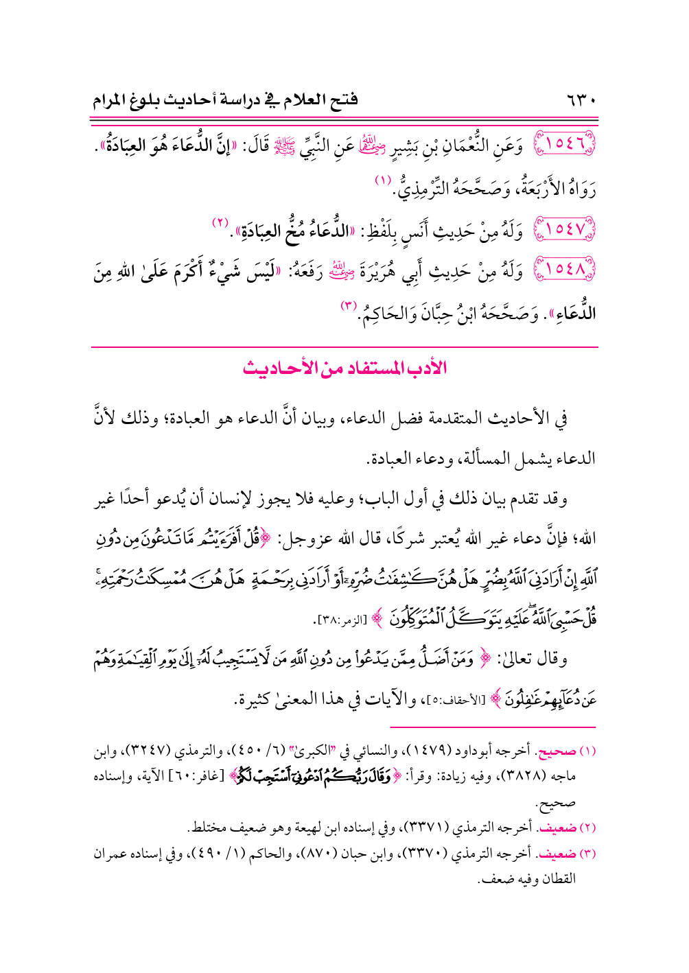 ١٥٤٦ - وَعَنِ النُّعْمَانِ بْنِ بَشِيرٍ -رضي الله عنهما- عَنِ النَّبِيِّ - صلى الله عليه وسلم - قَالَ: «إنَّ الدُّعَاءَ هُوَ العِبَادَةُ». رَوَاهُ الأَرْبَعَةُ، وَصَحَّحَهُ التِّرْمِذِيُّ. (¬١)