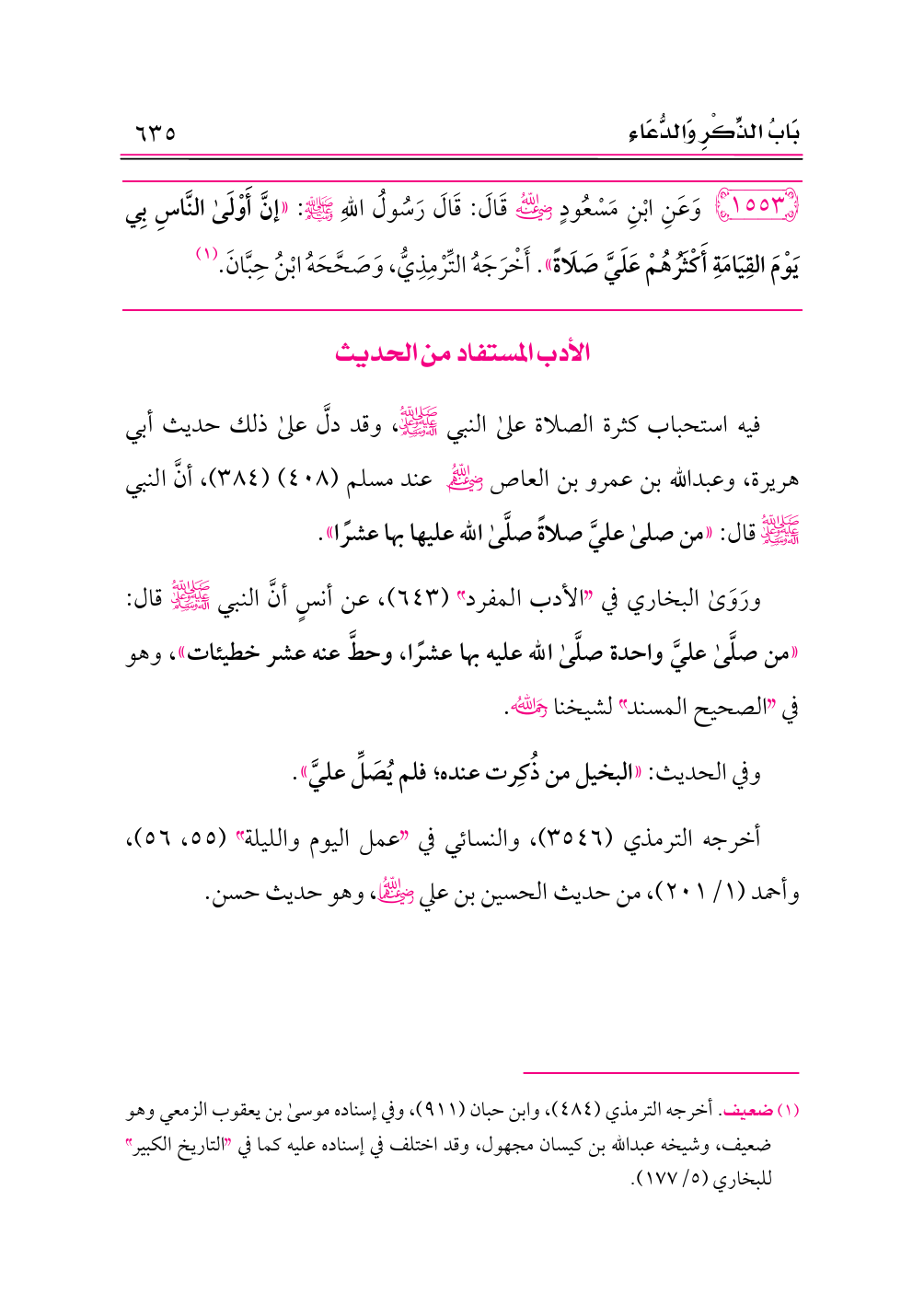 ١٥٥٣ - وَعَنِ ابْنِ مَسْعُودٍ -رضي الله عنه- قَالَ: قَالَ رَسُولُ اللهِ - صلى الله عليه وسلم -: «إنَّ أَوْلَى النَّاسِ بِي يَوْمَ القِيَامَةِ أَكْثَرُهُمْ عَلَيَّ صَلَاةً». أَخْرَجَهُ التِّرْمِذِيُّ، وَصَحَّحَهُ ابْنُ حِبَّانَ. (¬١)