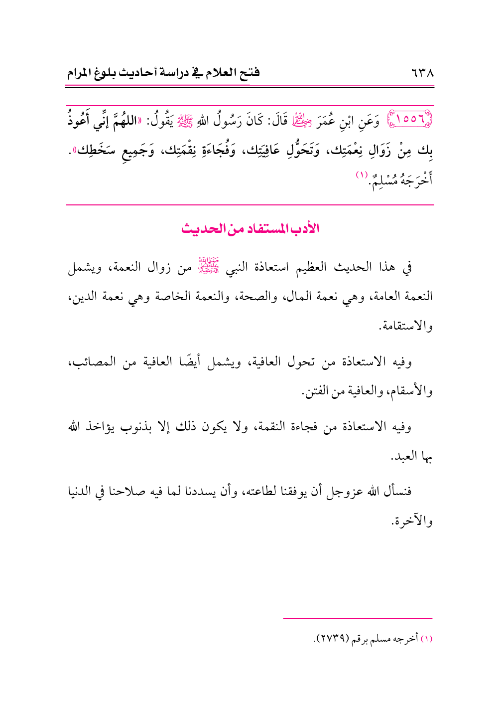 ١٥٥٦ - وَعَنِ ابْنِ عُمَرَ -رضي الله عنهما- قَالَ: كَانَ رَسُولُ اللهِ - صلى الله عليه وسلم - يَقُولُ: «اللهُمَّ إنِّي أَعُوذُ بِك مِنْ زَوَالِ نِعْمَتِك، وَتَحَوُّلِ عَافِيَتِك، وَفُجَاءَةِ نِقْمَتِك، وَجَمِيعِ سَخَطِك». أَخْرَجَهُ مُسْلِمٌ. (¬١)