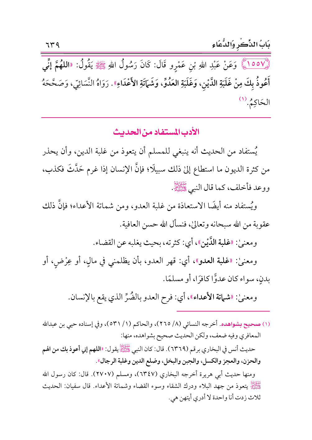 ١٥٥٧ - وَعَنْ عَبْدِ اللهِ بْنِ عَمْرٍو قَالَ: كَانَ رَسُولُ اللهِ - صلى الله عليه وسلم - يَقُولُ: «اللهُمَّ إنِّي أَعُوذُ بِكَ مِنْ غَلَبَةِ الدَّيْنِ، وَغَلَبَةِ العَدُوِّ، وَشَمَاتَةِ الأَعْدَاءِ». رَوَاهُ النَّسَائِيّ، وَصَحَّحَهُ الحَاكِمُ. (¬١)