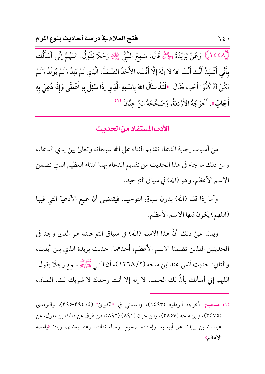 ويدل على ذلك أنَّ هذا الاسم (الله) في سياق التوحيد، هو الذي وجد في الحديثين اللذين تضمنا الاسم الأعظم، أحدهما: حديث بريدة الذي بين أيدينا، والثاني: حديث أنس عند ابن ماجه (٢/ ١٢٦٨)، أن النبي -صلى الله عليه وعلى آله وسلم- سمع رجلًا يقول: اللهم إني أسألك بأنَّ لك الحمد، لا إله إلا أنت وحدك لا شريك لك، المنان،