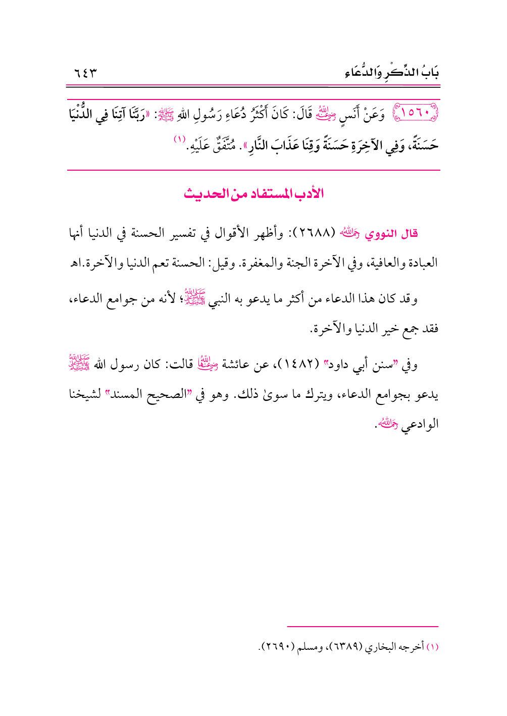 ١٥٦٠ - وَعَنْ أَنَسٍ -رضي الله عنه- قَالَ: كَانَ أَكْثَرُ دُعَاءِ رَسُولِ اللهِ - صلى الله عليه وسلم -: «رَبَّنَا آتِنَا فِي الدُّنْيَا حَسَنَةً، وَفِي الآخِرَةِ حَسَنَةً وَقِنَا عَذَابَ النَّارِ». مُتَّفَقٌ عَلَيْهِ. (¬١)