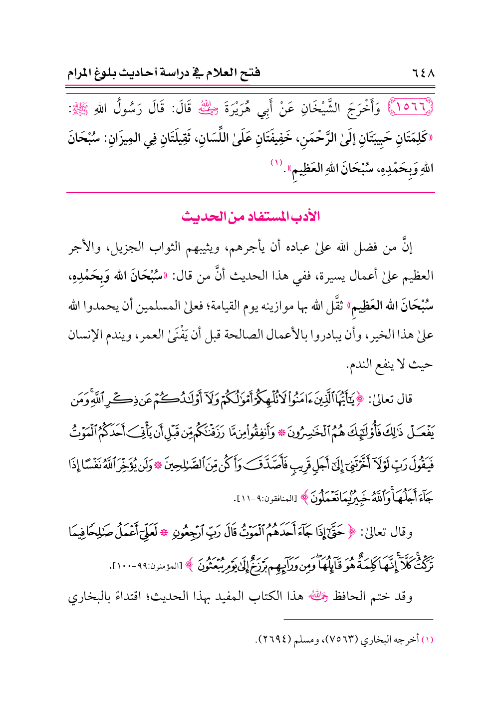 ١٥٦٦ - وَأَخْرَجَ الشَّيْخَانِ عَنْ أَبِي هُرَيْرَةَ -رضي الله عنه- قَالَ: قَالَ رَسُولُ اللهِ - صلى الله عليه وسلم -: «كَلِمَتَانِ حَبِيبَتَانِ إلَى الرَّحْمَنِ، خَفِيفَتَانِ عَلَى اللِّسَانِ، ثَقِيلَتَانِ فِي المِيزَانِ: سُبْحَانَ اللهِ وَبِحَمْدِهِ، سُبْحَانَ اللهِ العَظِيمِ». (¬١)