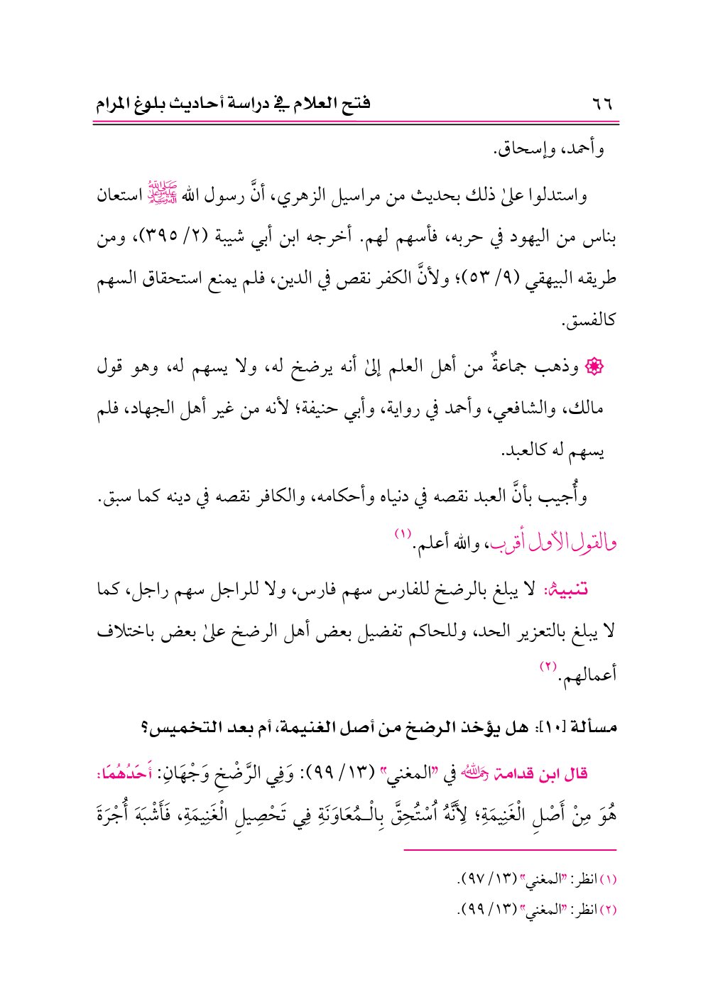 واستدلوا على ذلك بحديث من مراسيل الزهري، أنَّ رسول الله -صلى الله عليه وعلى آله وسلم- استعان بناس من اليهود في حربه، فأسهم لهم. أخرجه ابن أبي شيبة (٢/ ٣٩٥)، ومن طريقه البيهقي (٩/ ٥٣)؛ ولأنَّ الكفر نقص في الدين، فلم يمنع استحقاق السهم كالفسق.