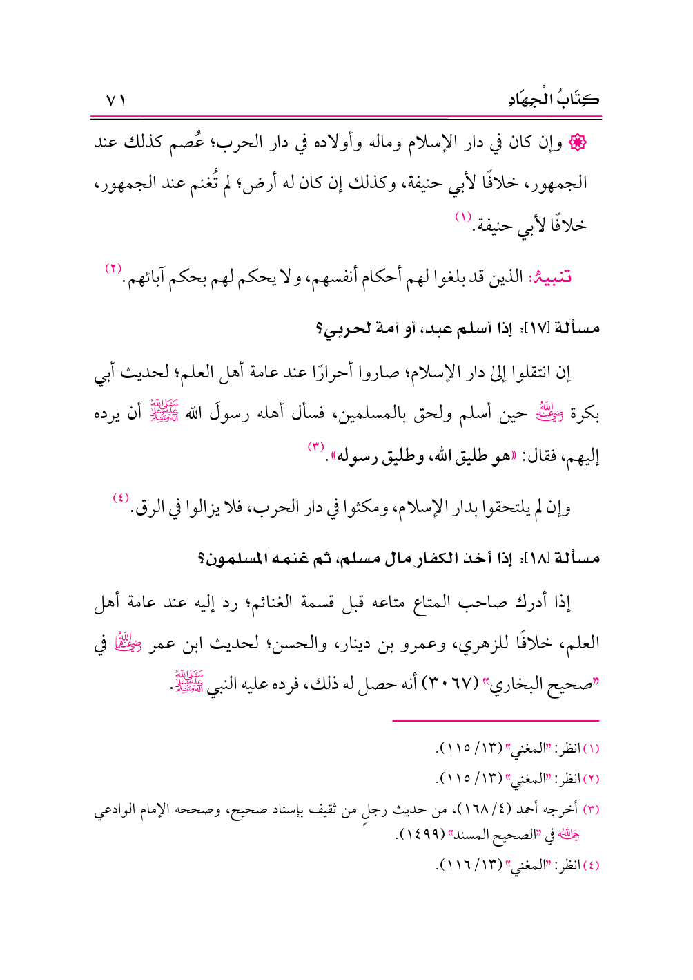 • وإن كان في دار الإسلام وماله وأولاده في دار الحرب؛ عُصم كذلك عند الجمهور، خلافًا لأبي حنيفة، وكذلك إن كان له أرض؛ لم تُغنم عند الجمهور، خلافًا لأبي حنيفة. (¬١)