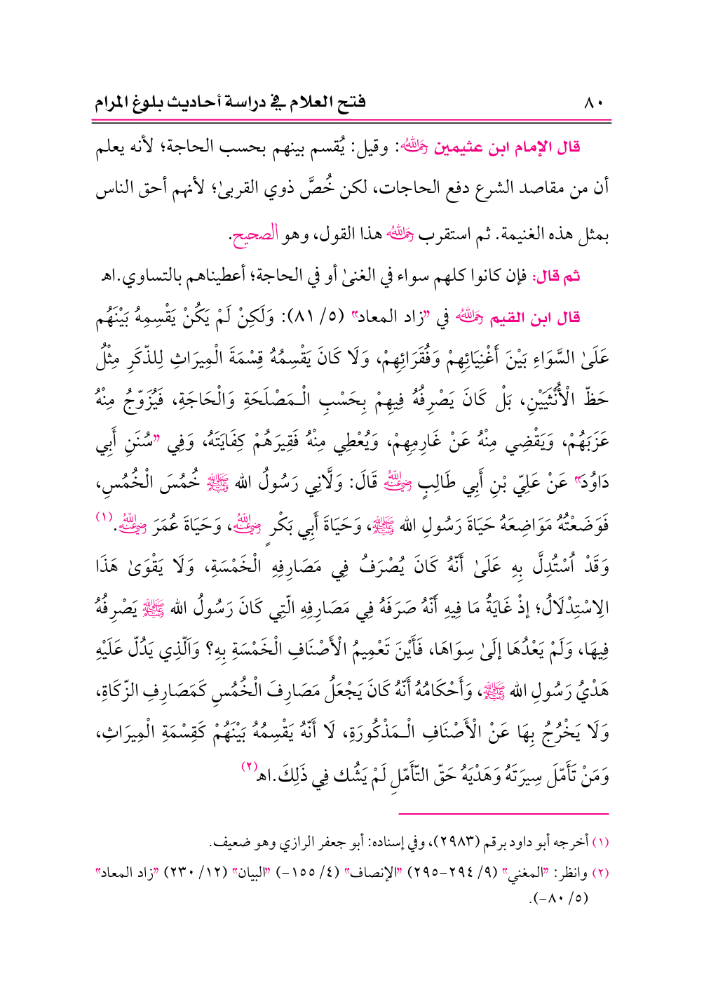قال ابن القيم -رحمه الله- في «زاد المعاد» (٥/ ٨١): وَلَكِنْ لَمْ يَكُنْ يَقْسِمِهُ بَيْنَهُم عَلَى السَّوَاءِ بَيْنَ أَغْنِيَائِهِمْ وَفُقَرَائِهِمْ، وَلَا كَانَ يَقْسِمُهُ قِسْمَةَ الْمِيرَاثِ لِلذّكَرِ مِثْلُ حَظّ الْأُنْثَيَيْنِ، بَلْ كَانَ يَصْرِفُهُ فِيهِمْ بِحَسْبِ الْمَصْلَحَةِ وَالْحَاجَةِ، فَيُزَوّجُ مِنْهُ عَزَبَهُمْ، وَيَقْضِي مِنْهُ عَنْ غَارِمِهِمْ، وَيُعْطِي مِنْهُ فَقِيرَهُمْ كِفَايَتَهُ، وَفِي «سُنَنِ أَبِي دَاوُدَ» عَنْ عَلِيّ بْنِ أَبِي طَالِبٍ -رضي الله عنه- قَالَ: وَلَّانِي رَسُولُ الله - صلى الله عليه وسلم - خُمُسَ الْخُمُسِ، فَوَضَعْتُهُ مَوَاضِعَهُ حَيَاةَ رَسُولِ الله - صلى الله عليه وسلم -، وَحَيَاةَ أَبِي بَكْرٍ -رضي الله عنه-، وَحَيَاةَ عُمَرَ -رضي الله عنه-. (¬١) وَقَدْ اُسْتُدِلَّ بِهِ عَلَى أَنّهُ كَانَ يُصْرَفُ فِي مَصَارِفِهِ الْخَمْسَةِ، وَلَا يَقْوَى هَذَا الِاسْتِدْلَالُ؛ إذْ غَايَةُ مَا فِيهِ أَنّهُ صَرَفَهُ فِي مَصَارِفِهِ الّتِي كَانَ رَسُولُ الله - صلى الله عليه وسلم - يَصْرِفُهُ فِيهَا، وَلَمْ يَعْدُهَا إلَى سِوَاهَا، فَأَيْنَ تَعْمِيمُ الْأَصْنَافِ الْخَمْسَةِ بِهِ؟ وَاَلّذِي يَدُلّ عَلَيْهِ هَدْيُ رَسُولِ الله - صلى الله عليه وسلم -، وَأَحْكَامُهُ أَنّهُ كَانَ يَجْعَلُ مَصَارِفَ الْخُمُسِ كَمَصَارِفِ الزّكَاةِ، وَلَا يَخْرُجُ بِهَا عَنْ الْأَصْنَافِ الْمَذْكُورَةِ، لَا أَنّهُ يَقْسِمُهُ بَيْنَهُمْ كَقِسْمَةِ الْمِيرَاثِ، وَمَنْ تَأَمّلَ سِيرَتَهُ وَهَدْيَهُ حَقّ التّأَمّلِ لَمْ يَشُك فِي ذَلِكَ. اهـ (¬٢)
