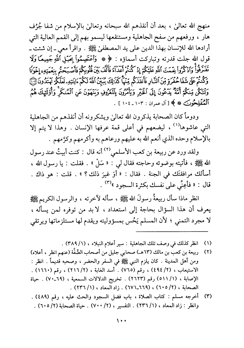 منهج الله تعالى، بعد أن أنقذهم الله سبحانه وتعالى بالإسلام من شفا جرف هار، ورفعهم من سفح الجاهلية ومستنقعها ليسمو بهم إلى القمم العالية التي أرادها الله للإنسان بهذا الدين على يد المصطفى صلى الله عليه وسلم. واقرأ معي- إن شئت- قول الله جلت قدرته وتباركت أسماؤه: وَاعْتَصِمُوا بِحَبْلِ اللَّهِ جَمِيعاً وَلا تَفَرَّقُوا وَاذْكُرُوا نِعْمَتَ اللَّهِ عَلَيْكُمْ إِذْ كُنْتُمْ أَعْداءً فَأَلَّفَ بَيْنَ قُلُوبِكُمْ فَأَصْبَحْتُمْ بِنِعْمَتِهِ إِخْواناً وَكُنْتُمْ عَلى شَفا حُفْرَةٍ مِنَ النَّارِ فَأَنْقَذَكُمْ مِنْها كَذلِكَ يُبَيِّنُ اللَّهُ لَكُمْ آياتِهِ لَعَلَّكُمْ تَهْتَدُونَ (103) وَلْتَكُنْ مِنْكُمْ أُمَّةٌ يَدْعُونَ إِلَى الْخَيْرِ وَيَأْمُرُونَ بِالْمَعْرُوفِ وَيَنْهَوْنَ عَنِ الْمُنْكَرِ وَأُولئِكَ هُمُ الْمُفْلِحُونَ [آل عمران: 103- 104] .