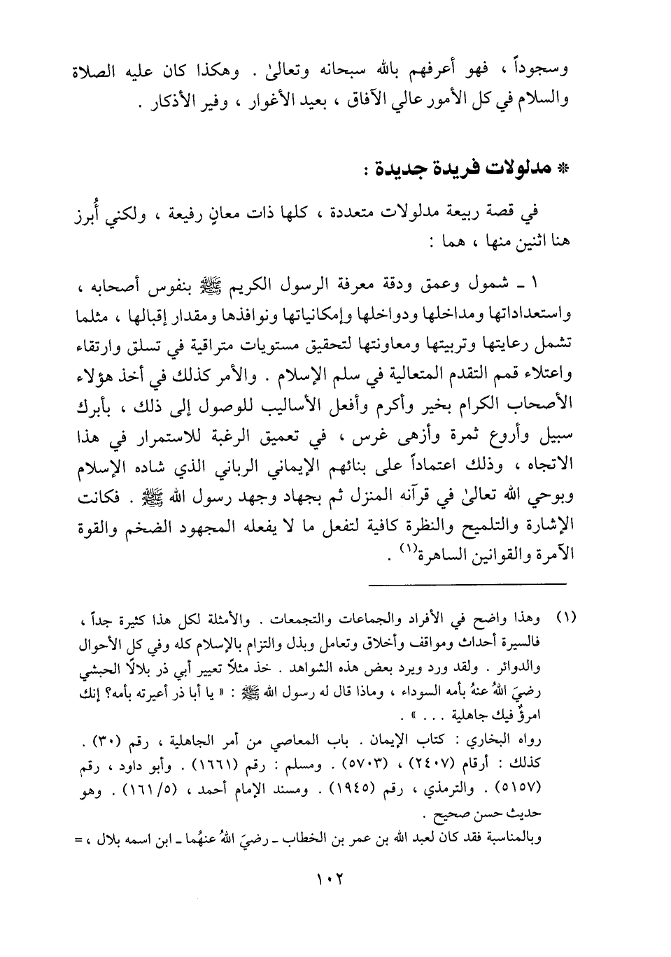 (1) وهذا واضح في الأفراد والجماعات والتجمعات. والأمثلة لكل هذا كثيرة جدا، فالسيرة أحداث ومواقف وأخلاق وتعامل وبذل والتزام بالإسلام كله وفي كل الأحوال والدوائر. ولقد ورد ويرد بعض هذه الشواهد. خذ مثلا تعيير أبي ذر بلالا الحبشي رضي الله عنه بأمه السوداء، وماذا قال له رسول الله صلّى الله عليه وسلم: «يا أبا ذر أعيرته بأمه؟ إنك امرؤ فيك جاهلية ... » . رواه البخاري: كتاب الإيمان. باب المعاصي من أمر الجاهلية، رقم (30) . كذلك: أرقام (2407) ، (5703) . ومسلم: رقم (1661) . وأبو داود، رقم (5157) . والترمذي، رقم (1945) . ومسند الإمام أحمد، (5/ 161) . وهو حديث حسن صحيح. وبالمناسبة فقد كان لعبد الله بن عمر بن الخطاب- رضي الله عنهما- ابن اسمه بلال،