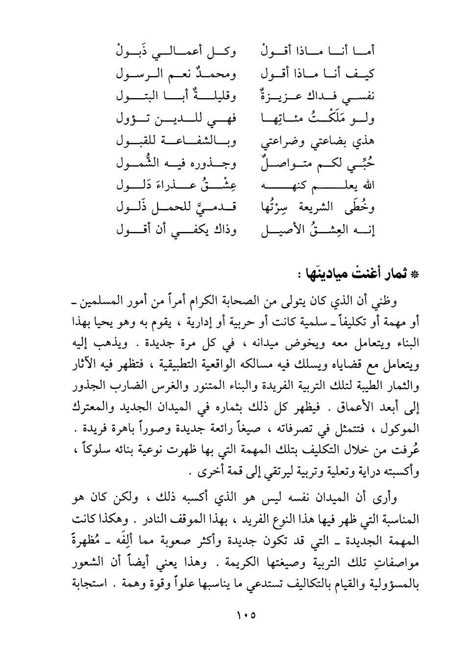 وأرى أن الميدان نفسه ليس هو الذي أكسبه ذلك، ولكن كان هو المناسبة التي ظهر فيها هذا النوع الفريد، بهذا الموقف النادر. وهكذا كانت المهمة الجديدة- التي قد تكون جديدة وأكثر صعوبة مما ألفه- مظهرة مواصفات تلك التربية وصيغتها الكريمة. وهذا يعني أيضا أن الشعور بالمسؤولية والقيام بالتكاليف تستدعي ما يناسبها علوا وقوة وهمة. استجابة