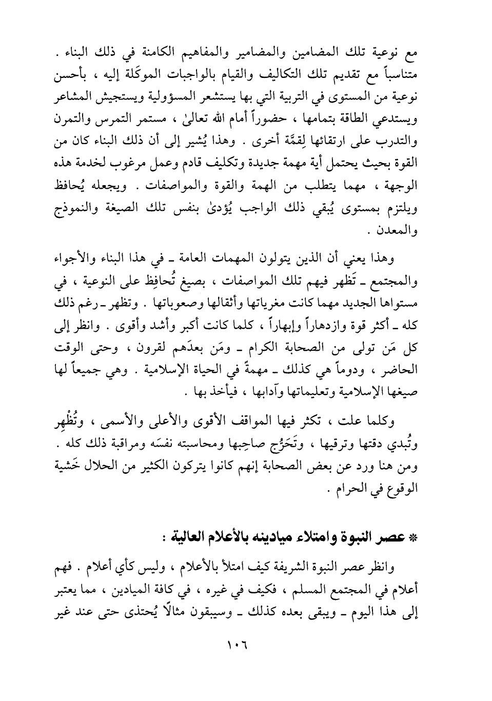 وهذا يعني أن الذين يتولون المهمات العامة- في هذا البناء والأجواء والمجتمع- تظهر فيهم تلك المواصفات، بصيغ تحافظ على النوعية، في مستواها الجديد مهما كانت مغرياتها وأثقالها وصعوباتها. وتظهر- رغم ذلك كله- أكثر قوة وازدهارا وإبهارا، كلما كانت أكبر وأشد وأقوى. وانظر إلى كل من تولى من الصحابة الكرام- ومن بعدهم لقرون، وحتى الوقت الحاضر، ودوما هي كذلك- مهمة في الحياة الإسلامية. وهي جميعا لها صيغها الإسلامية وتعليماتها وآدابها، فيأخذ بها.