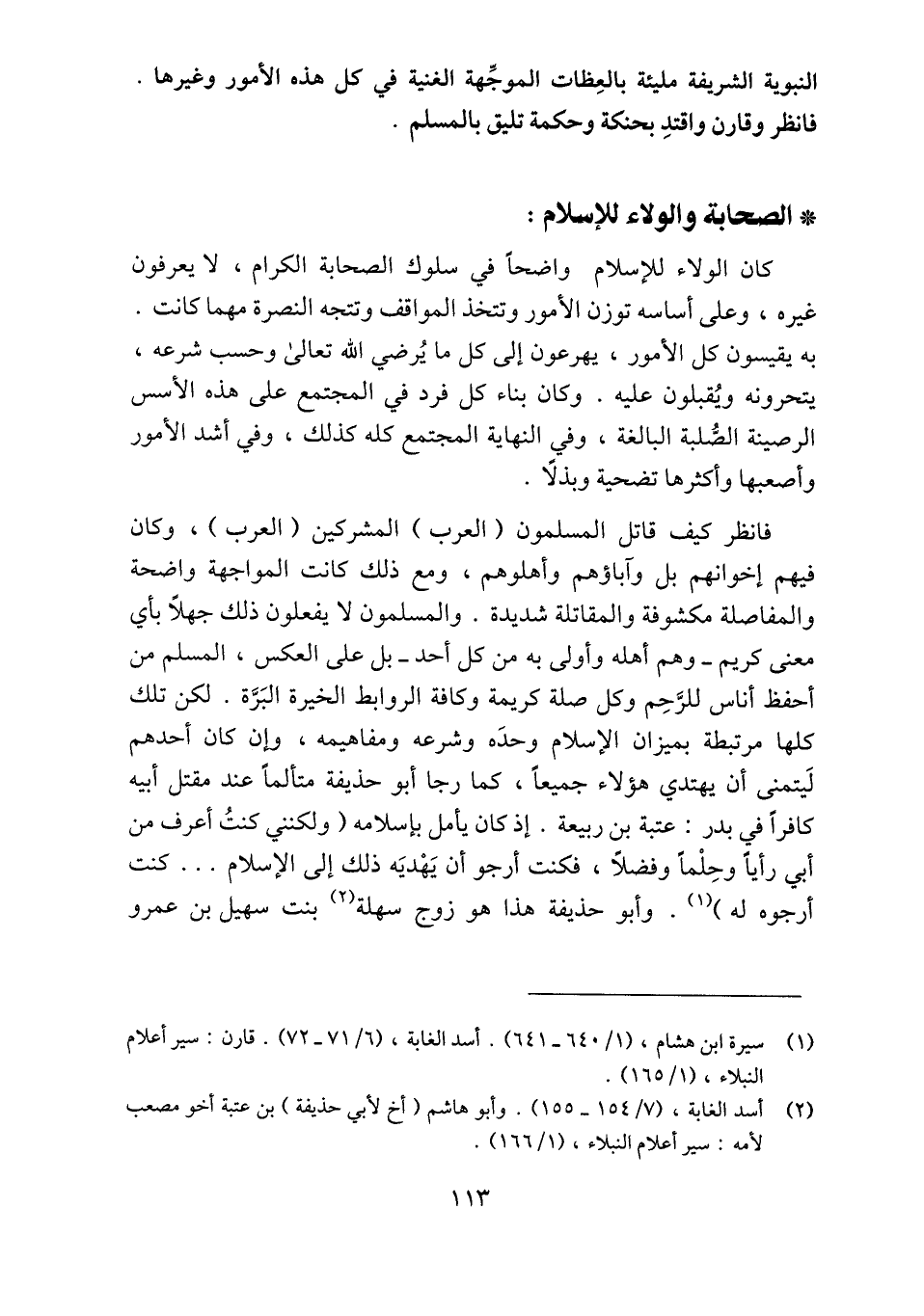 فانظر كيف قاتل المسلمون (العرب) المشركين (العرب) ، وكان فيهم إخوانهم بل وآباؤهم وأهلوهم، ومع ذلك كانت المواجهة واضحة والمفاصلة مكشوفة والمقاتلة شديدة. والمسلمون لا يفعلون ذلك جهلا بأي معنى كريم- وهم أهله وأولى به من كل أحد- بل على العكس، المسلم من أحفظ أناس للرّحم وكل صلة كريمة وكافة الروابط الخيرة البرّة. لكن تلك كلها مرتبطة بميزان الإسلام وحده وشرعه ومفاهيمه، وإن كان أحدهم ليتمنى أن يهتدي هؤلاء جميعا، كما رجا أبو حذيفة متألما عند مقتل أبيه كافرا في بدر: عتبة بن ربيعة. إذ كان يأمل بإسلامه (ولكنني كنت أعرف من أبي رأيا وحلما وفضلا، فكنت أرجو أن يهديه ذلك إلى الإسلام ... كنت أرجوه له) «1» . وأبو حذيفة هذا هو زوج سهلة «2» بنت سهيل بن عمرو