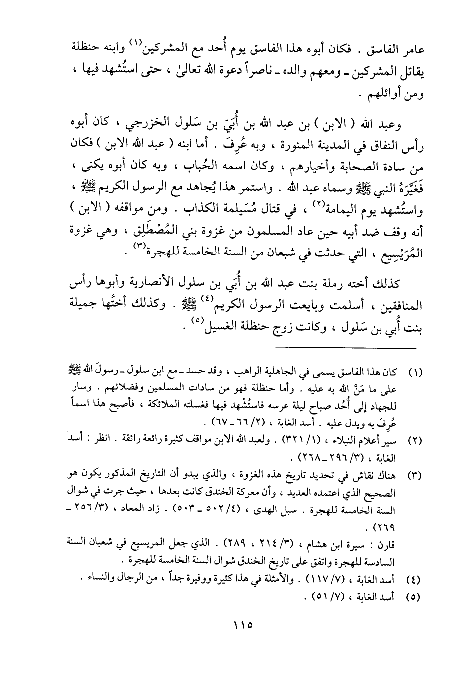 وعبد الله (الابن) بن عبد الله بن أبيّ بن سلول الخزرجي، كان أبوه رأس النفاق في المدينة المنورة، وبه عرف. أما ابنه (عبد الله الابن) فكان من سادة الصحابة وأخيارهم، وكان اسمه الحباب، وبه كان أبوه يكنى، فغيّره النبي صلّى الله عليه وسلّم وسماه عبد الله. واستمر هذا يجاهد مع الرسول الكريم صلّى الله عليه وسلم، واستشهد يوم اليمامة «2» ، في قتال مسيلمة الكذاب. ومن مواقفه (الابن) أنه وقف ضد أبيه حين عاد المسلمون من غزوة بني المصطلق، وهي غزوة المريسيع، التي حدثت في شعبان من السنة الخامسة للهجرة «3» .