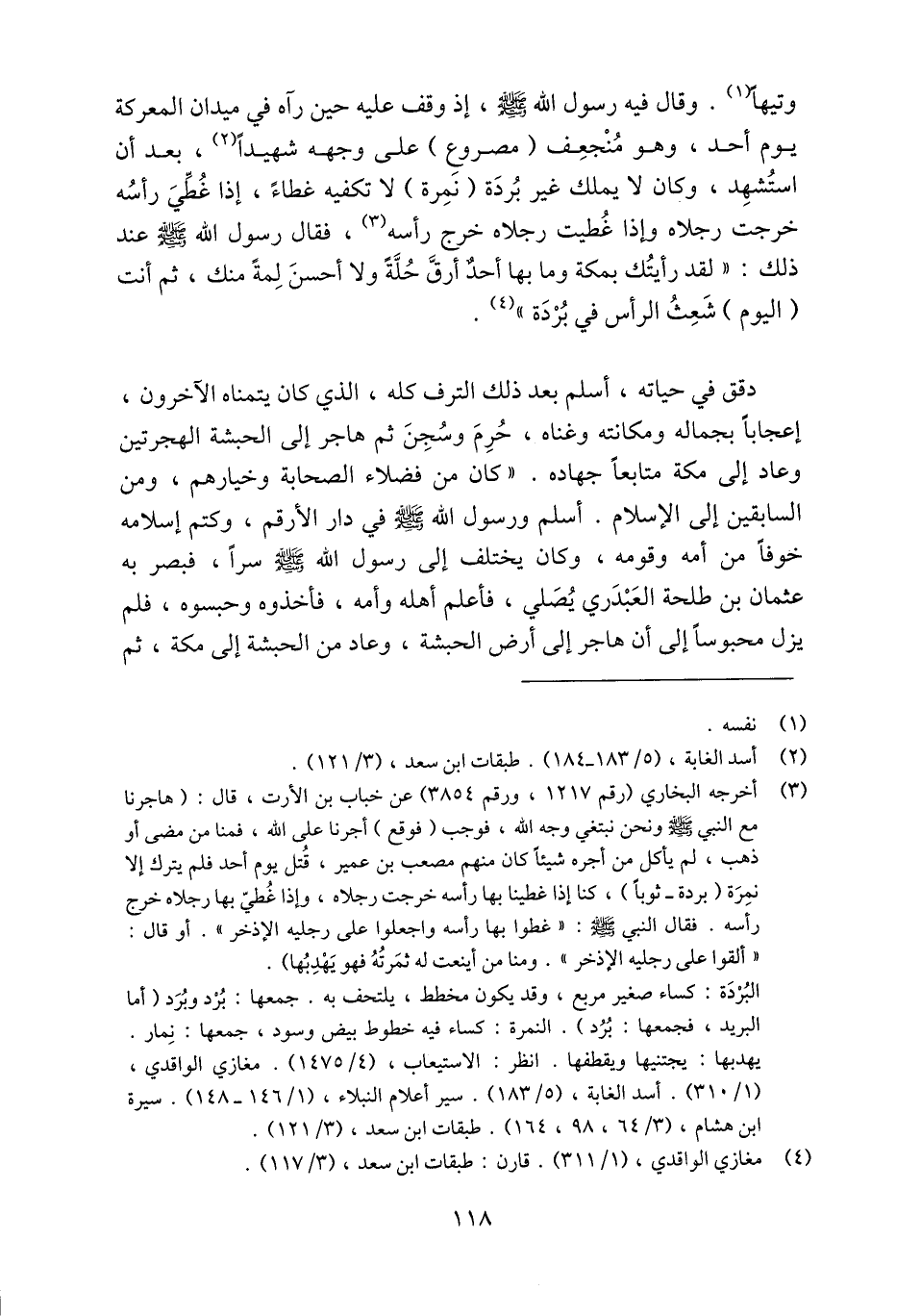 (3) أخرجه البخاري (رقم 1217، ورقم 3854) عن خباب بن الأرت، قال: (هاجرنا مع النبي صلّى الله عليه وسلّم ونحن نبتغي وجه الله، فوجب (فوقع) أجرنا على الله، فمنا من مضى أو ذهب، لم يأكل من أجره شيئا كان منهم مصعب بن عمير، قتل يوم أحد فلم يترك إلا نمرة (بردة- ثوبا) ، كنا إذا غطينا بها رأسه خرجت رجلاه، وإذا غطيّ بها رجلاه خرج رأسه. فقال النبي صلّى الله عليه وسلم: «غطوا بها رأسه واجعلوا على رجليه الإذخر» . أو قال: «ألقوا على رجليه الإذخر» . ومنا من أينعت له ثمرته فهو يهدبها) . البردة: كساء صغير مربع، وقد يكون مخطط، يلتحف به. جمعها: برد وبرد (أما البريد، فجمعها: برد) . النمرة: كساء فيه خطوط بيض وسود، جمعها: نمار. يهدبها: يجتنيها ويقطفها. انظر: الاستيعاب، (4/ 1475) . مغازي الواقدي، (1/ 310) . أسد الغابة، (5/ 183) . سير أعلام النبلاء، (1/ 164- 148) . سيرة ابن هشام، (3/ 64، 98، 164) . طبقات ابن سعد، (3/ 121) .