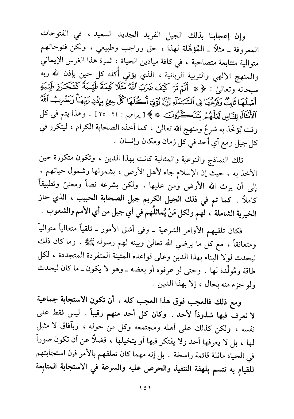 وإن إعجابنا بذلك الجيل الفريد الجديد السعيد، في الفتوحات المعروفة- مثلا- المؤهّلة لهذا، حق وواجب وطبيعي، ولكن فتوحاتهم متوالية متتابعة متصاحبة، في كافة ميادين الحياة، ثمرة هذا الغرس الإيماني والمنهج الإلهي والتربية الربانية، الذي يؤتي أكله كل حين بإذن الله ربه سبحانه وتعالى: أَلَمْ تَرَ كَيْفَ ضَرَبَ اللَّهُ مَثَلًا كَلِمَةً طَيِّبَةً كَشَجَرَةٍ طَيِّبَةٍ أَصْلُها ثابِتٌ وَفَرْعُها فِي السَّماءِ (24) تُؤْتِي أُكُلَها كُلَّ حِينٍ بِإِذْنِ رَبِّها وَيَضْرِبُ اللَّهُ الْأَمْثالَ لِلنَّاسِ لَعَلَّهُمْ يَتَذَكَّرُونَ [إبراهيم: 24- 25] . وهذا يتم في كل وقت يؤخذ به شرع ومنهج الله تعالى، كما أخذه الصحابة الكرام، ليتكرر في كل جيل ومع أي أحد في كل زمان ومكان وإنسان.