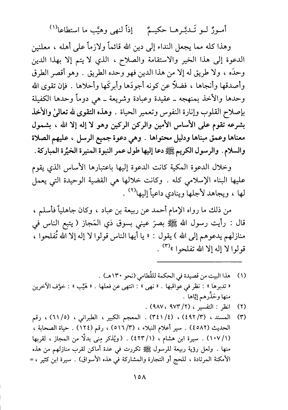 (3) المسند، (3/ 492) ، (4/ 341) . المعجم الكبير، الطبراني، (5/ 61) ، رقم الحديث (4582) . سير أعلام النبلاء، (3/ 516) ، رقم (124) . حياة الصحابة، (1/ 107) . سيرة ابن هشام، (1/ 423) . (ويذكر منى بدلا من المجاز، لقربها منها. ولعل رؤية ربيعة للرسول صلّى الله عليه وسلّم تكررت في عدة أماكن لقرب منازلهم من هذه الأمكنة المرتادة، للحج أو التجارة والمشاركة في هذه الأسواق) . سيرة ابن كثير،