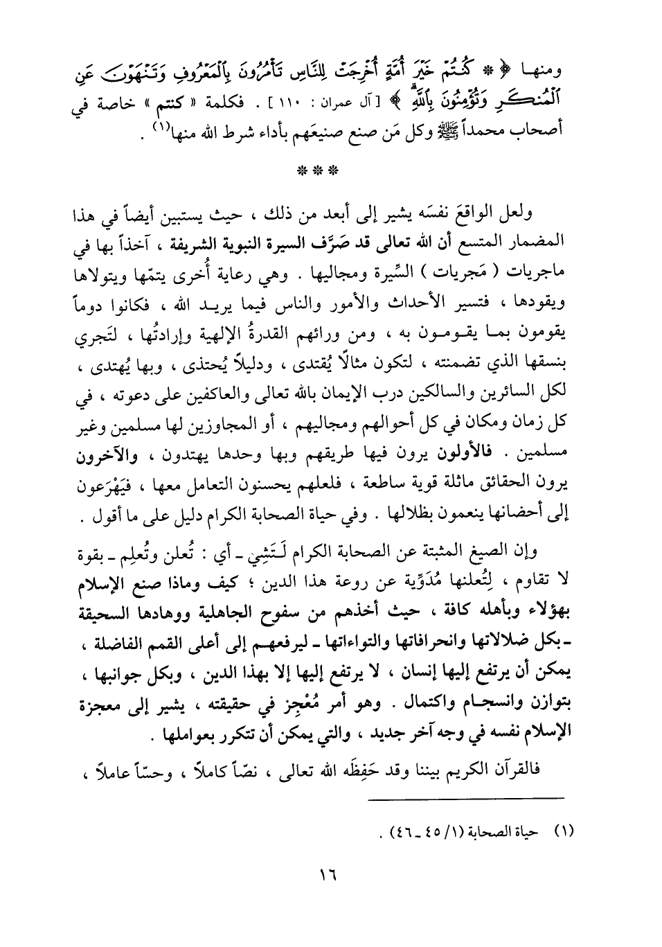 ومنها كُنْتُمْ خَيْرَ أُمَّةٍ أُخْرِجَتْ لِلنَّاسِ تَأْمُرُونَ بِالْمَعْرُوفِ وَتَنْهَوْنَ عَنِ الْمُنْكَرِ وَتُؤْمِنُونَ بِاللَّهِ [آل عمران: 110] . فكلمة «كنتم» خاصة في أصحاب محمدا صلى الله عليه وسلم وكل من صنع صنيعهم بأداء شرط الله منها «1» .