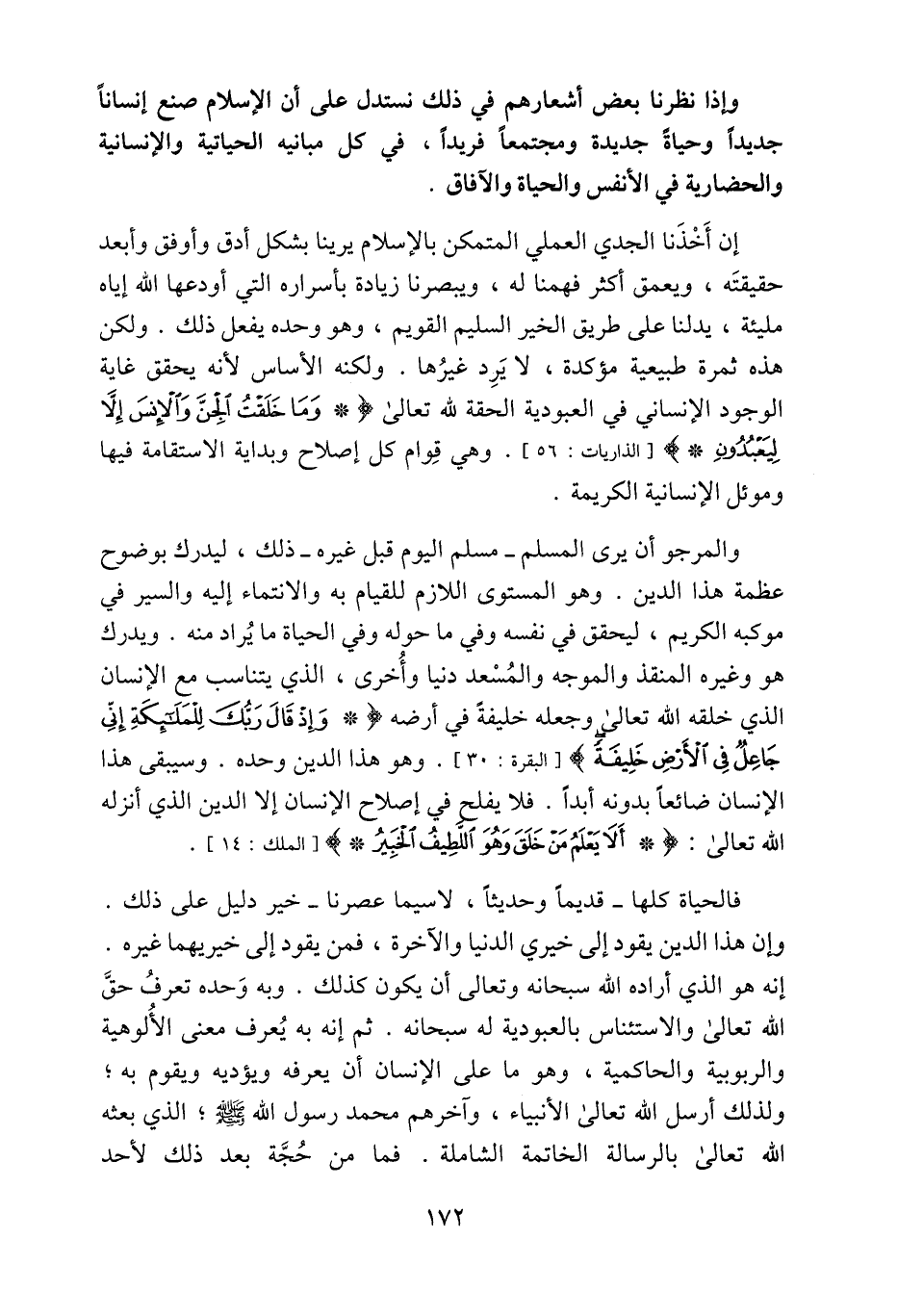 والمرجو أن يرى المسلم- مسلم اليوم قبل غيره- ذلك، ليدرك بوضوح عظمة هذا الدين. وهو المستوى اللازم للقيام به والانتماء إليه والسير في موكبه الكريم، ليحقق في نفسه وفي ما حوله وفي الحياة ما يراد منه. ويدرك هو وغيره المنقذ والموجه والمسعد دنيا وأخرى، الذي يتناسب مع الإنسان الذي خلقه الله تعالى وجعله خليفة في أرضه وَإِذْ قالَ رَبُّكَ لِلْمَلائِكَةِ إِنِّي جاعِلٌ فِي الْأَرْضِ خَلِيفَةً [البقرة: 30] . وهو هذا الدين وحده. وسيبقى هذا الإنسان ضائعا بدونه أبدا. فلا يفلح في إصلاح الإنسان إلا الدين الذي أنزله الله تعالى: أَلا يَعْلَمُ مَنْ خَلَقَ وَهُوَ اللَّطِيفُ الْخَبِيرُ [الملك: 14] .