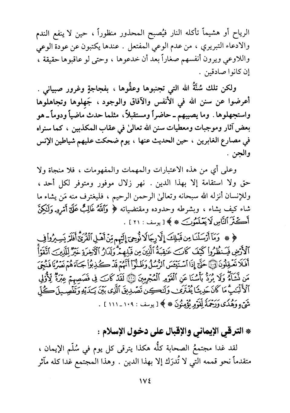 وَما أَرْسَلْنا مِنْ قَبْلِكَ إِلَّا رِجالًا نُوحِي إِلَيْهِمْ مِنْ أَهْلِ الْقُرى أَفَلَمْ يَسِيرُوا فِي الْأَرْضِ فَيَنْظُرُوا كَيْفَ كانَ عاقِبَةُ الَّذِينَ مِنْ قَبْلِهِمْ وَلَدارُ الْآخِرَةِ خَيْرٌ لِلَّذِينَ اتَّقَوْا أَفَلا تَعْقِلُونَ (109) حَتَّى إِذَا اسْتَيْأَسَ الرُّسُلُ وَظَنُّوا أَنَّهُمْ قَدْ كُذِبُوا جاءَهُمْ نَصْرُنا فَنُجِّيَ مَنْ نَشاءُ وَلا يُرَدُّ بَأْسُنا عَنِ الْقَوْمِ الْمُجْرِمِينَ (110) لَقَدْ كانَ فِي قَصَصِهِمْ عِبْرَةٌ لِأُولِي الْأَلْبابِ ما كانَ حَدِيثاً يُفْتَرى وَلكِنْ تَصْدِيقَ الَّذِي بَيْنَ يَدَيْهِ وَتَفْصِيلَ كُلِّ شَيْءٍ وَهُدىً وَرَحْمَةً لِقَوْمٍ يُؤْمِنُونَ [يوسف: 109- 111] .