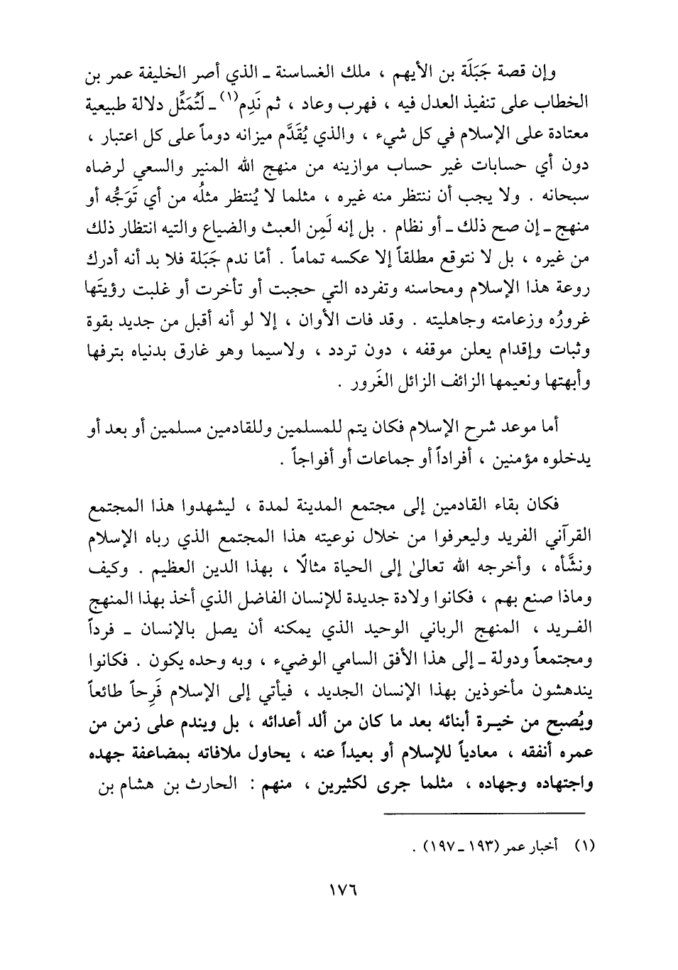 وإن قصة جبلة بن الأيهم، ملك الغساسنة- الذي أصر الخليفة عمر بن الخطاب على تنفيذ العدل فيه، فهرب وعاد، ثم ندم «1» - لتمثّل دلالة طبيعية معتادة على الإسلام في كل شيء، والذي يقدّم ميزانه دوما على كل اعتبار، دون أي حسابات غير حساب موازينه من منهج الله المنير والسعي لرضاه سبحانه. ولا يجب أن ننتظر منه غيره، مثلما لا ينتظر مثله من أي توجّه أو منهج- إن صح ذلك- أو نظام. بل إنه لمن العبث والضياع والتيه انتظار ذلك من غيره، بل لا نتوقع مطلقا إلا عكسه تماما. أمّا ندم جبلة فلا بد أنه أدرك روعة هذا الإسلام ومحاسنه وتفرده التي حجبت أو تأخرت أو غلبت رؤيتها غروره وزعامته وجاهليته. وقد فات الأوان، إلا لو أنه أقبل من جديد بقوة وثبات وإقدام يعلن موقفه، دون تردد، ولا سيما وهو غارق بدنياه بترفها وأبهتها ونعيمها الزائف الزائل الغرور.
