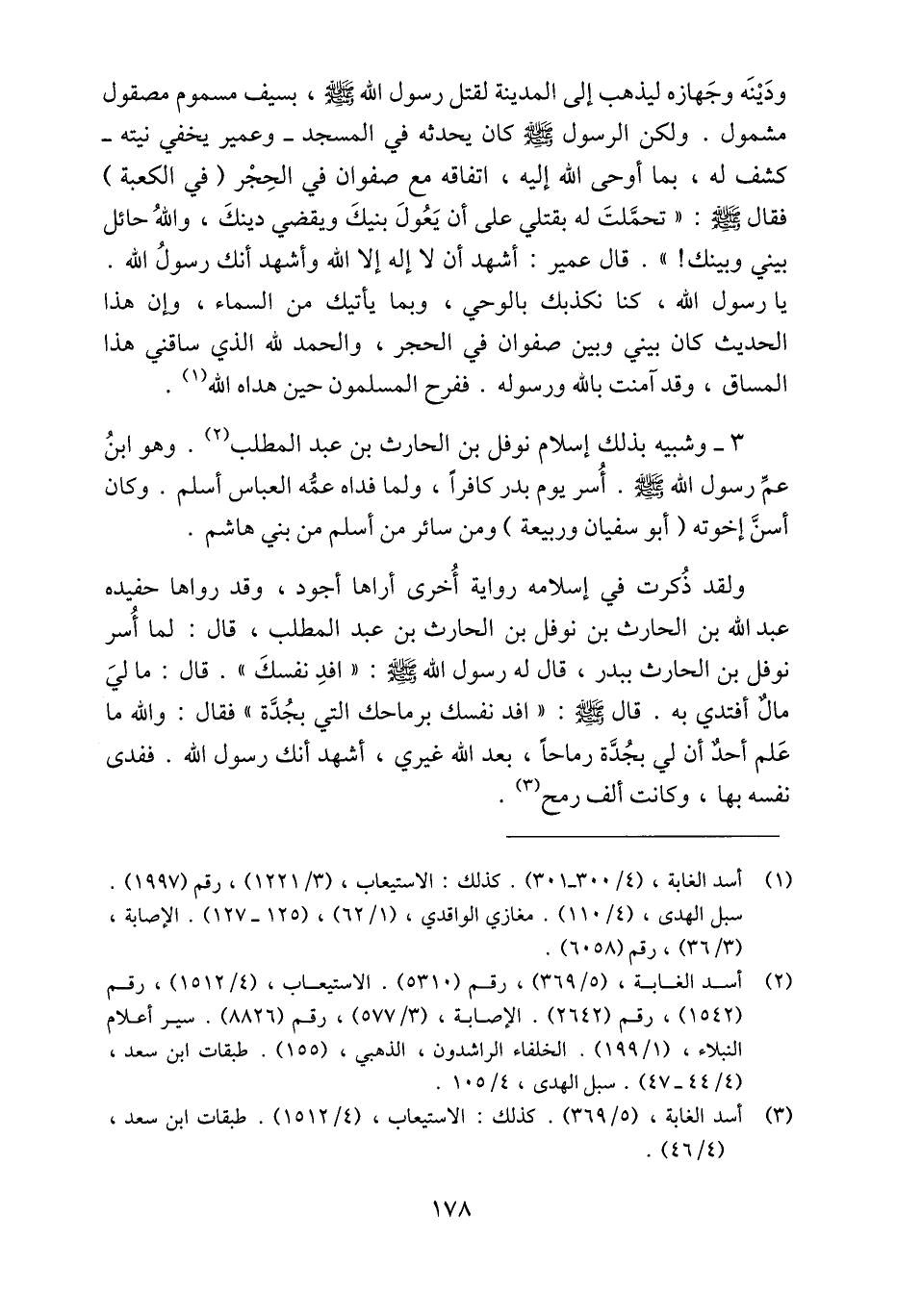 3- وشبيه بذلك إسلام نوفل بن الحارث بن عبد المطلب «2» . وهو ابن عمّ رسول الله صلّى الله عليه وسلم. أسر يوم بدر كافرا، ولما فداه عمّه العباس أسلم. وكان أسنّ إخوته (أبو سفيان وربيعة) ومن سائر من أسلم من بني هاشم.