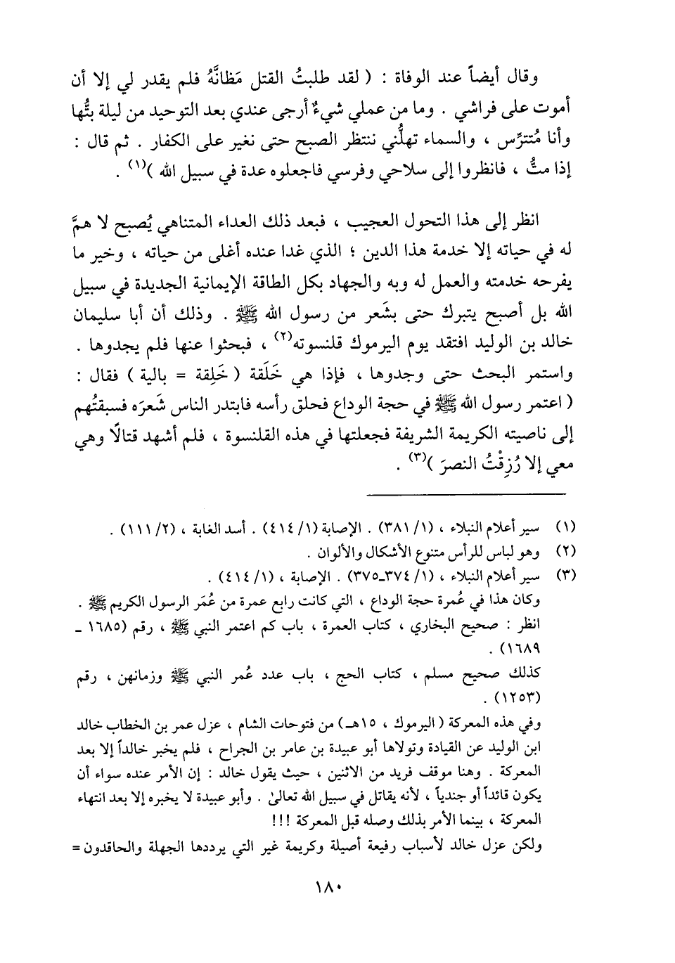 انظر إلى هذا التحول العجيب، فبعد ذلك العداء المتناهي يصبح لا همّ له في حياته إلا خدمة هذا الدين؛ الذي غدا عنده أغلى من حياته، وخير ما يفرحه خدمته والعمل له وبه والجهاد بكل الطاقة الإيمانية الجديدة في سبيل الله بل أصبح يتبرك حتى بشعر من رسول الله صلّى الله عليه وسلم. وذلك أن أبا سليمان خالد بن الوليد افتقد يوم اليرموك قلنسوته «2» ، فبحثوا عنها فلم يجدوها.