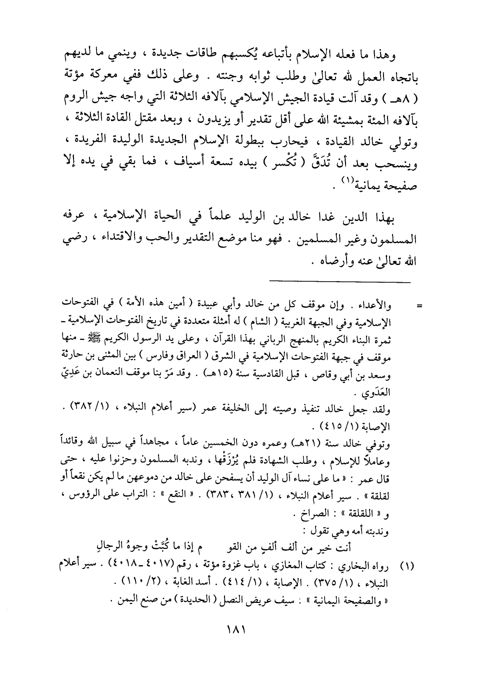 (1) رواه البخاري: كتاب المغازي، باب غزوة مؤتة، رقم (4017- 4018) . سير أعلام النبلاء، (1/ 375) . الإصابة، (1/ 414) . أسد الغابة، (2/ 110) . «والصفيحة اليمانية» . سيف عريض النصل (الحديدة) من صنع اليمن.