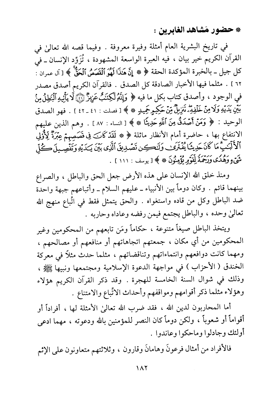 في تاريخ البشرية العام أمثلة وفيرة معروفة. وفيما قصه الله تعالى في القرآن الكريم خير بيان، فيه العبرة الواسعة المشهودة، تزوّد الإنسان- في كل جيل- بالخبرة المؤكدة الحقة إِنَّ هذا لَهُوَ الْقَصَصُ الْحَقُّ [آل عمران: