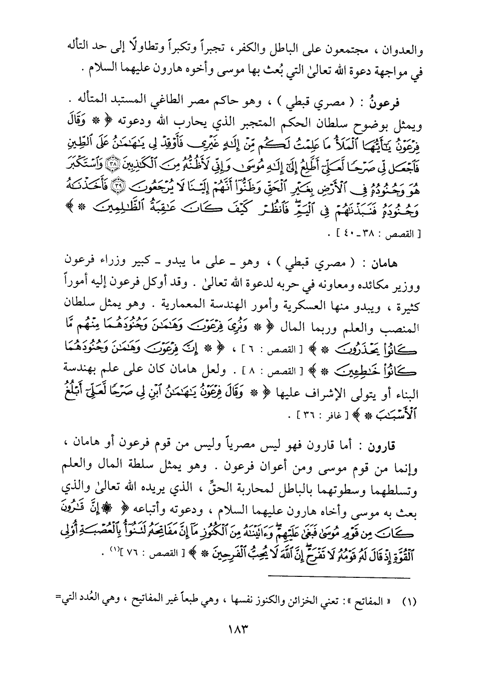 قارون: أما قارون فهو ليس مصريا وليس من قوم فرعون أو هامان، وإنما من قوم موسى ومن أعوان فرعون. وهو يمثل سلطة المال والعلم وتسلطهما وسطوتهما بالباطل لمحاربة الحقّ، الذي يريده الله تعالى والذي بعث به موسى وأخاه هارون عليهما السلام، ودعوته وأتباعه إِنَّ قارُونَ كانَ مِنْ قَوْمِ مُوسى فَبَغى عَلَيْهِمْ وَآتَيْناهُ مِنَ الْكُنُوزِ ما إِنَّ مَفاتِحَهُ لَتَنُوأُ بِالْعُصْبَةِ أُولِي الْقُوَّةِ إِذْ قالَ لَهُ قَوْمُهُ لا تَفْرَحْ إِنَّ اللَّهَ لا يُحِبُّ الْفَرِحِينَ [القصص: 76] «1» .