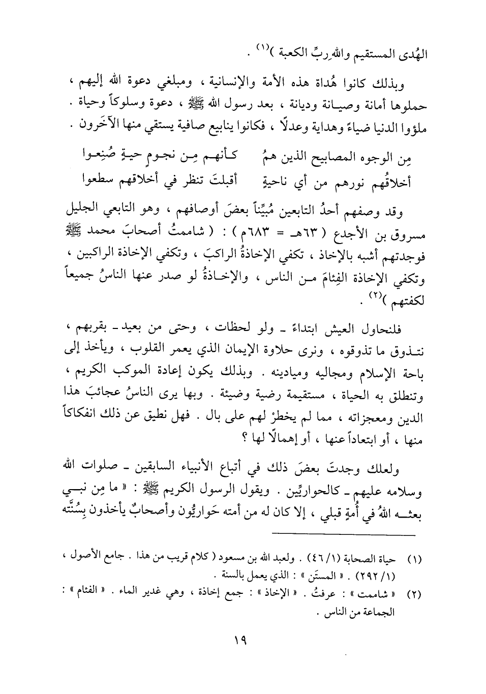 ولعلك وجدت بعض ذلك في أتباع الأنبياء السابقين- صلوات الله وسلامه عليهم- كالحواريّين. ويقول الرسول الكريم صلى الله عليه وسلم: «ما من نبي بعثه الله في أمة قبلي، إلا كان له من أمته حواريّون وأصحاب يأخذون بسنّته