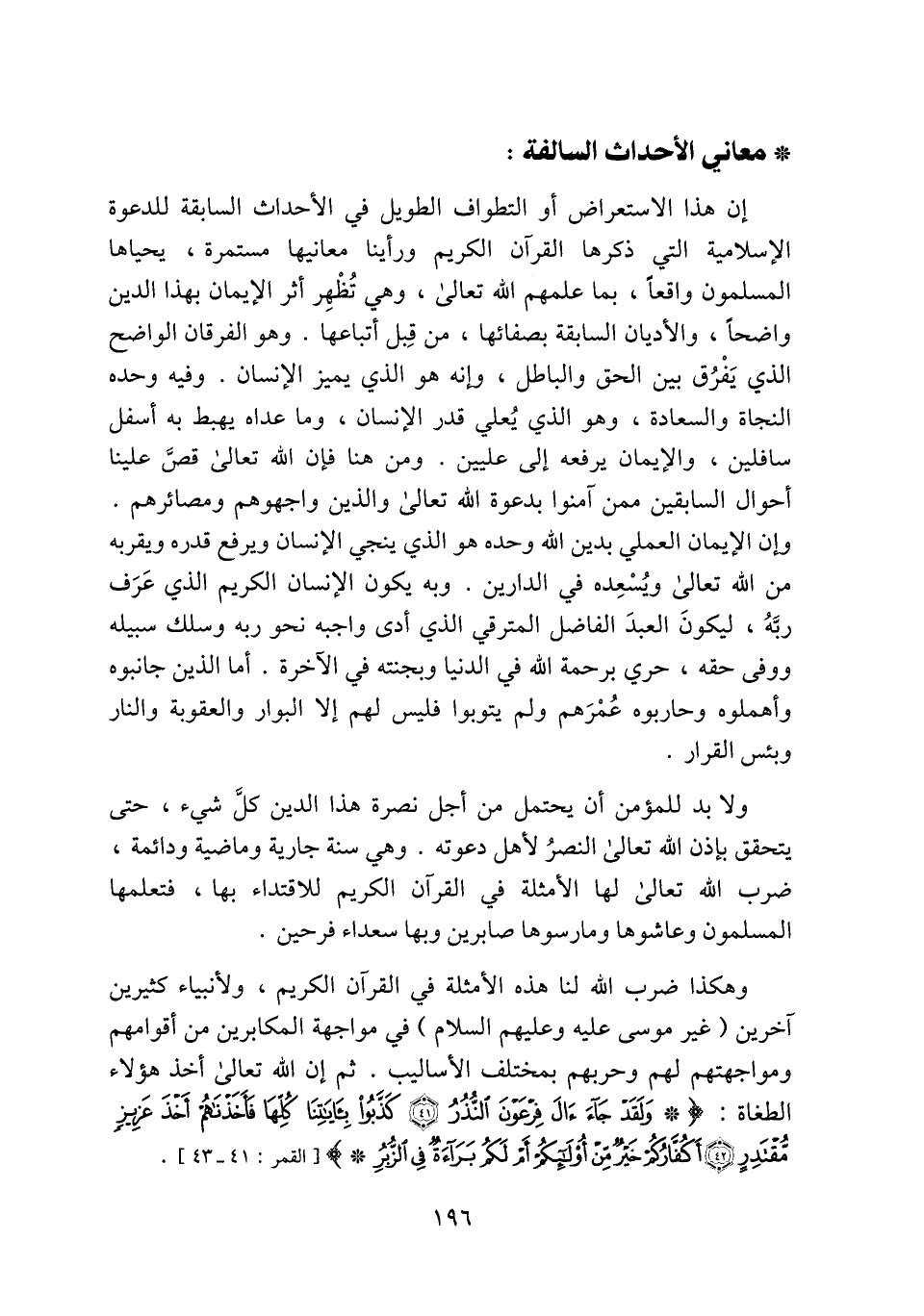 إن هذا الاستعراض أو التطواف الطويل في الأحداث السابقة للدعوة الإسلامية التي ذكرها القرآن الكريم ورأينا معانيها مستمرة، يحياها المسلمون واقعا، بما علمهم الله تعالى، وهي تظهر أثر الإيمان بهذا الدين واضحا، والأديان السابقة بصفائها، من قبل أتباعها. وهو الفرقان الواضح الذي يفرق بين الحق والباطل، وإنه هو الذي يميز الإنسان. وفيه وحده النجاة والسعادة، وهو الذي يعلي قدر الإنسان، وما عداه يهبط به أسفل سافلين، والإيمان يرفعه إلى عليين. ومن هنا فإن الله تعالى قصّ علينا أحوال السابقين ممن آمنوا بدعوة الله تعالى والذين واجهوهم ومصائرهم.