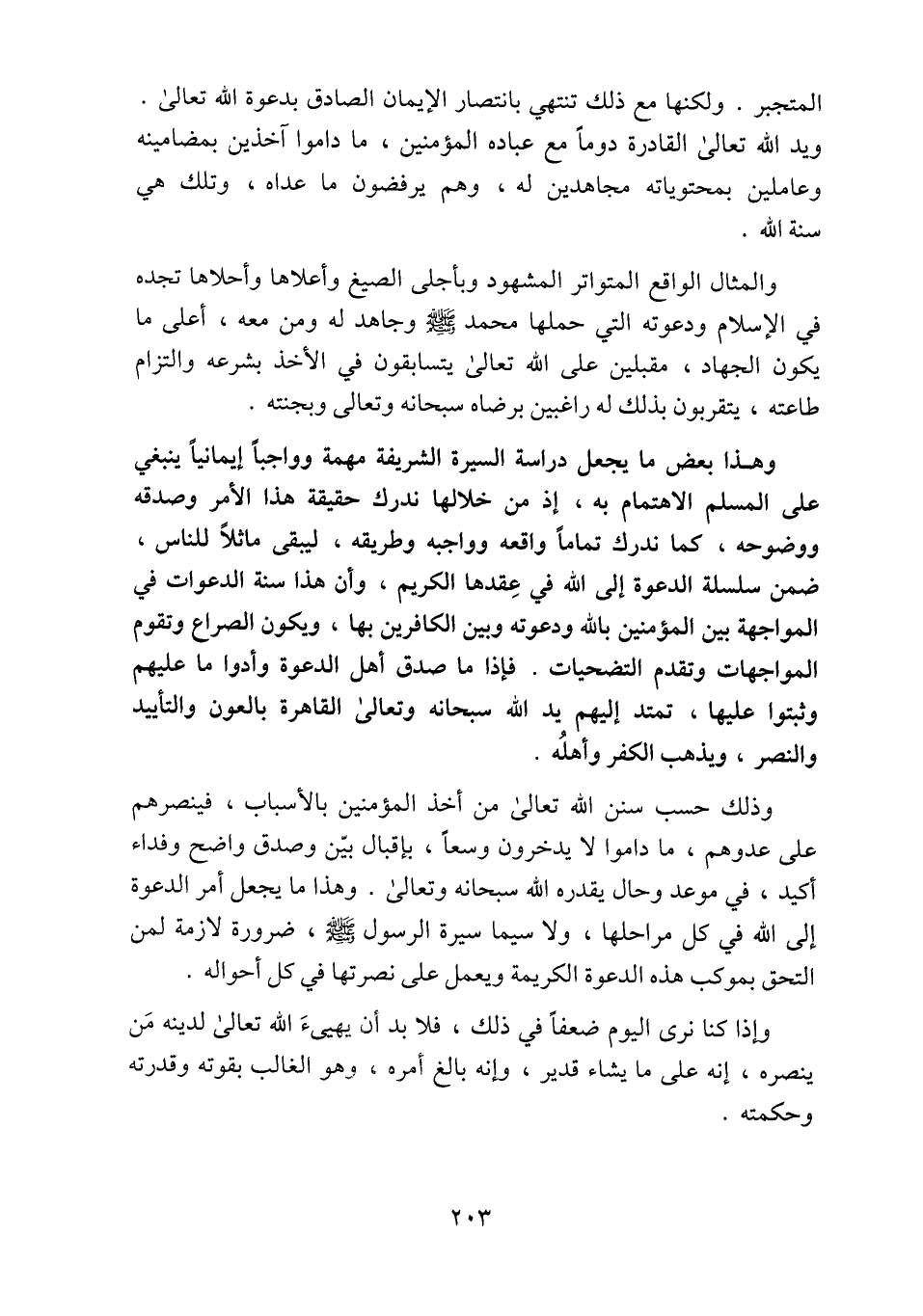 وذلك حسب سنن الله تعالى من أخذ المؤمنين بالأسباب، فينصرهم على عدوهم، ما داموا لا يدخرون وسعا، بإقبال بيّن وصدق واضح وفداء أكيد، في موعد وحال يقدره الله سبحانه وتعالى. وهذا ما يجعل أمر الدعوة إلى الله في كل مراحلها، ولا سيما سيرة الرسول صلّى الله عليه وسلم، ضرورة لازمة لمن التحق بموكب هذه الدعوة الكريمة ويعمل على نصرتها في كل أحواله.