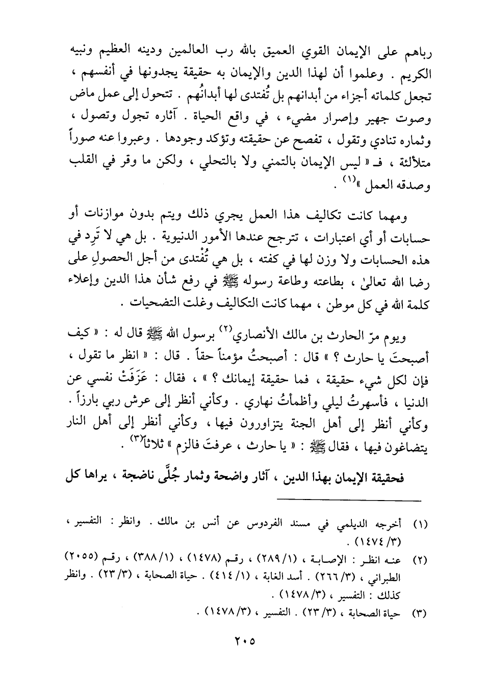رباهم على الإيمان القوي العميق بالله رب العالمين ودينه العظيم ونبيه الكريم. وعلموا أن لهذا الدين والإيمان به حقيقة يجدونها في أنفسهم، تجعل كلماته أجزاء من أبدانهم بل تفتدى لها أبدانهم. تتحول إلى عمل ماض وصوت جهير وإصرار مضئ، في واقع الحياة. آثاره تجول وتصول، وثماره تنادي وتقول، تفصح عن حقيقته وتؤكد وجودها. وعبروا عنه صورا متلألئة، ف «ليس الإيمان بالتمني ولا بالتحلي، ولكن ما وقر في القلب وصدقه العمل» «1» .