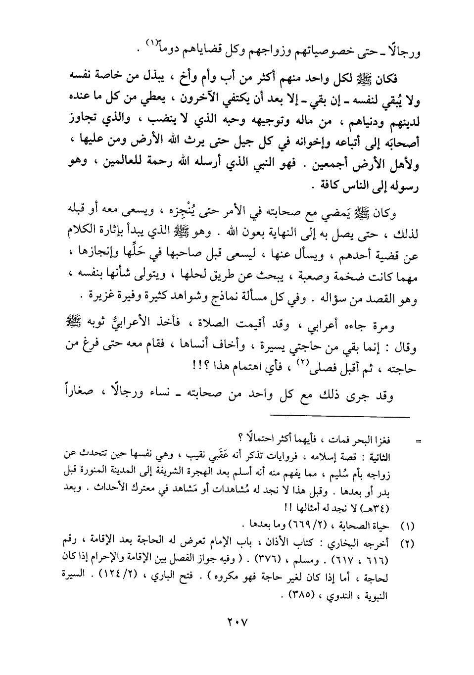 ومرة جاءه أعرابي، وقد أقيمت الصلاة، فأخذ الأعرابيّ ثوبه صلّى الله عليه وسلم وقال: إنما بقي من حاجتي يسيرة، وأخاف أنساها، فقام معه حتى فرغ من حاجته، ثم أقبل فصلى «2» ، فأي اهتمام هذا؟!!