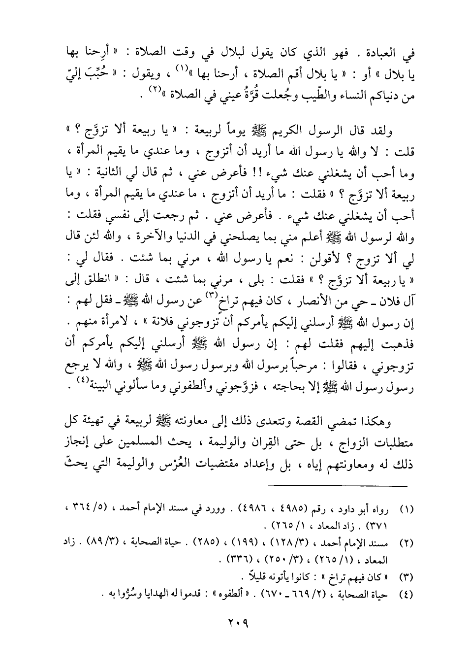 «يا ربيعة ألا تزوّج؟» فقلت: بلى، مرني بما شئت، قال: «انطلق إلى آل فلان- حي من الأنصار، كان فيهم تراخ «3» عن رسول الله صلّى الله عليه وسلم- فقل لهم: